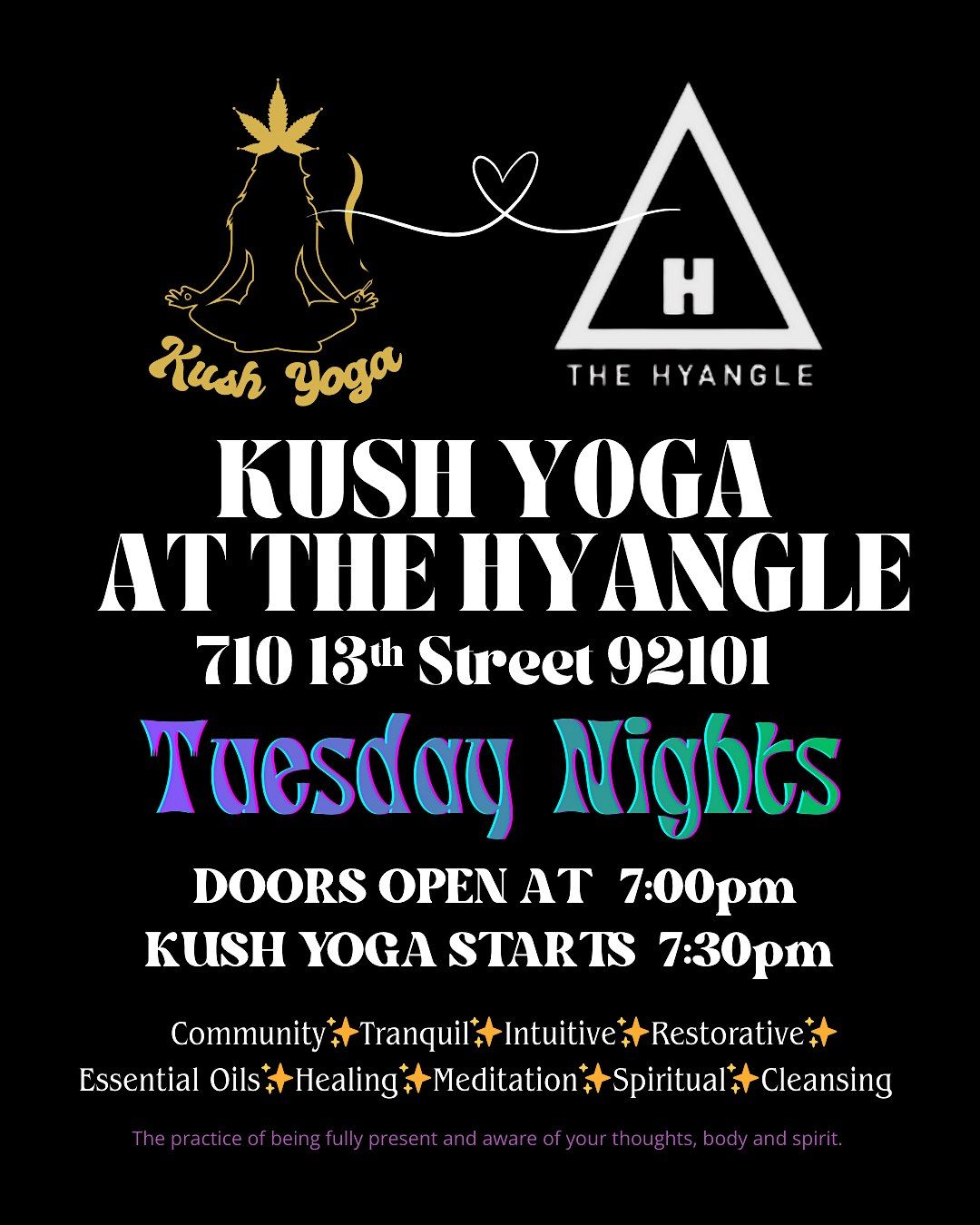 Welcome to Kush Yoga's Tuesdays All-Levels Restore & Ascend Indica Session at The Hyangle in San Diego's East Village. Doors open at 7pm for community elevation before Kush Yoga session at 7:30pm. Also featuring Drea's healing Juices for purchase. Bring your yoga mat and good vibes! Tuesdaze has begun!