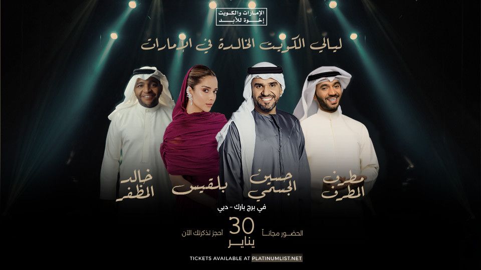 "Layali Al-Kuwait Al-Khalida fi Dubai" (Kuwait’s Eternal Nights in Dubai) brings together Hussain Al Jassmi, Balqees, Mutref Al-Mutref, and Khaled Al-Muthafar for a special open-air evening at Burj Park, Downtown Dubai.