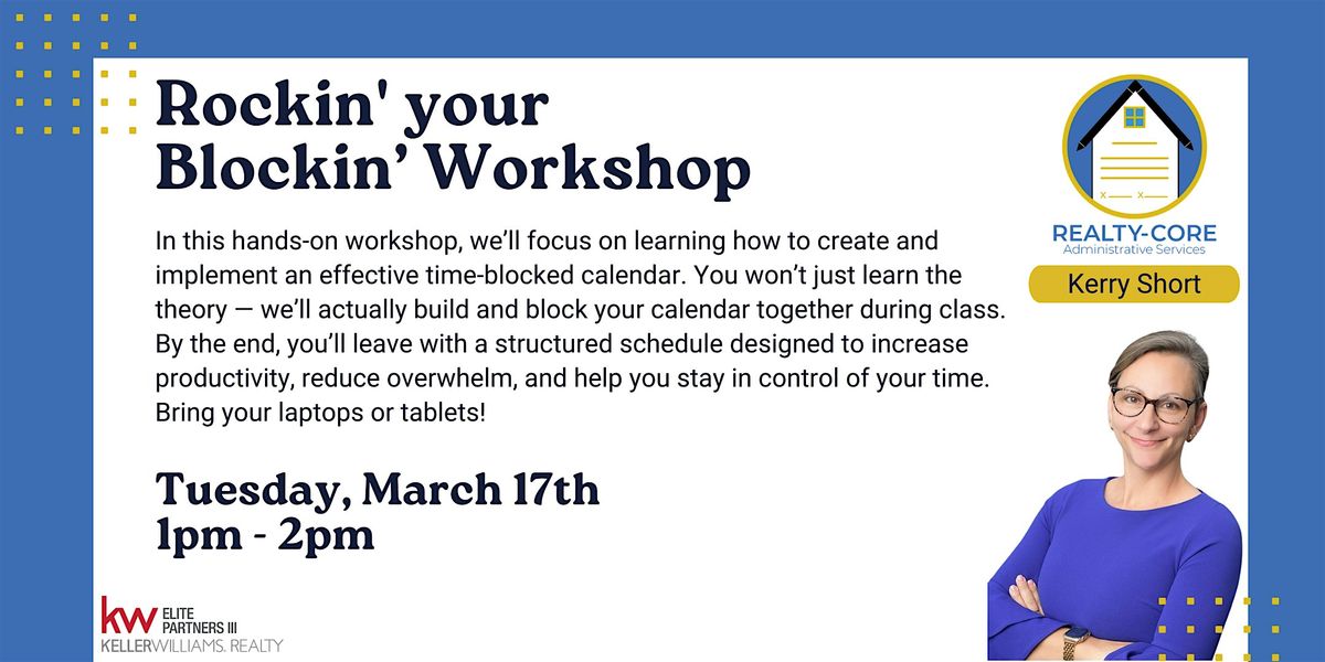 In this hands-on workshop, we’ll focus on learning how to create and implement an effective time-blocked calendar. You won’t just learn the theory — we’ll actually build and block your calendar together during class. By the end, you’ll leave with a structured schedule designed to increase productivity, reduce overwhelm, and help you stay in control of your time. Bring your laptops or tablets!