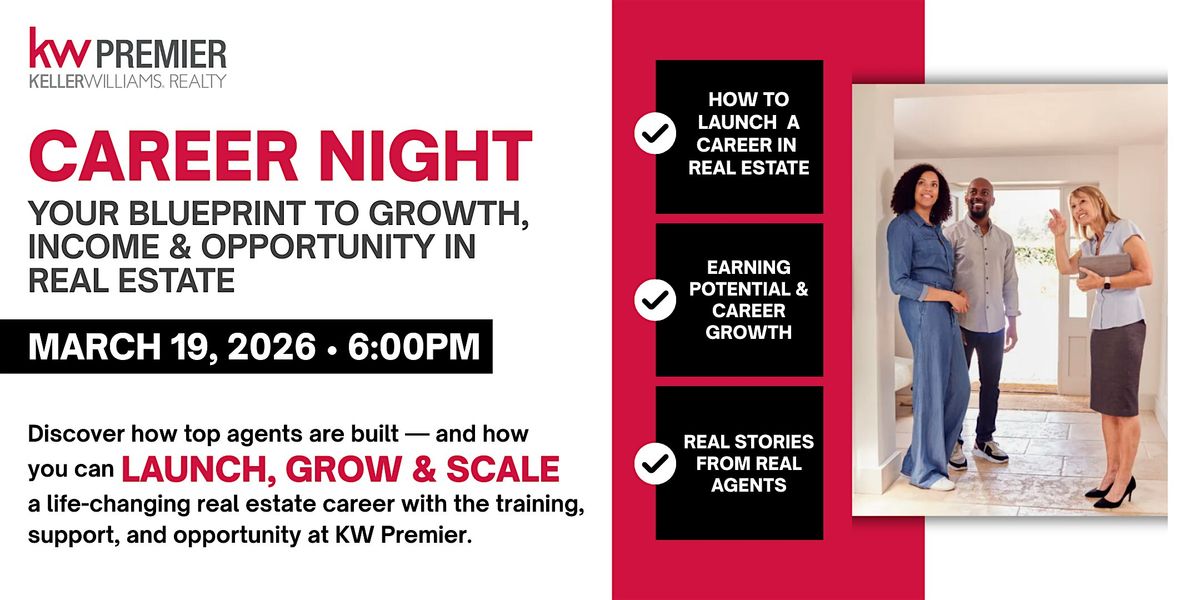 Are you considering a career in real estate β or looking for a brokerage that offers real growth and support? Join us for KW Premier Real Estate Career Night, a no-pressure, in-person informational session designed to give you a clear, honest look at what it takes to build a successful real estate career.