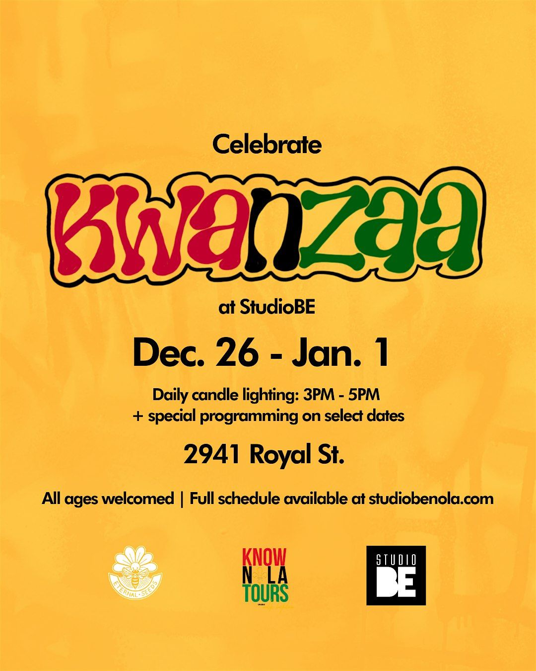 This Kwanzaa season, StudioBE, Eternal Seeds, and Know NOLA Tours invites you to come together for a week of reflection, connection, and shared celebration. Our programming centers community, creativity, and collective care. whether you join us for a daily moment of reflection or attend one of our special events, all are welcome.