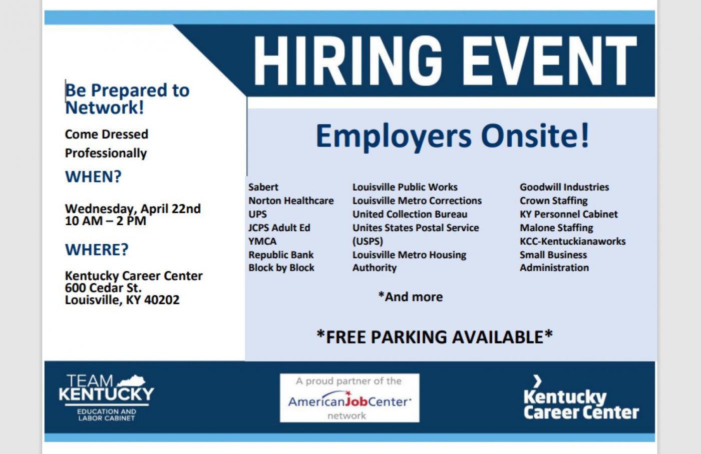 Unleash new career possibilities at the KY Career Center Quarterly Job Fair! Join us on April 22, 2026, at 10:00 AM, at 600 Cedar St, Louisville, KY for a dynamic event that bridges jobseekers with exciting opportunities.