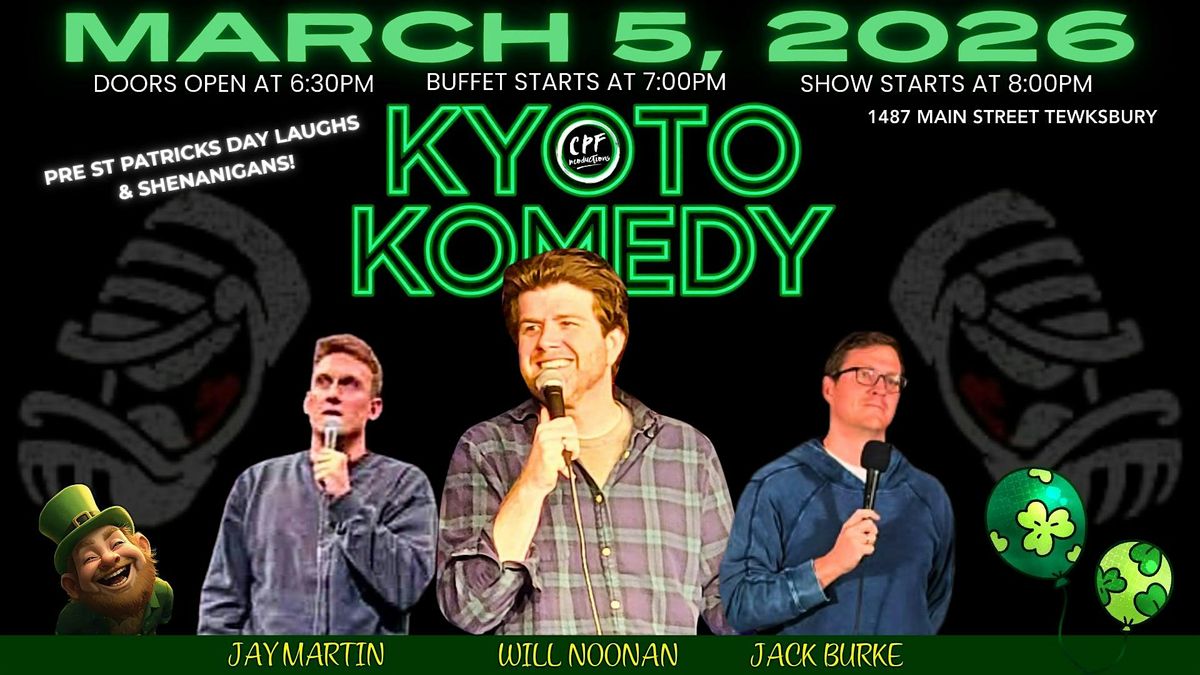 We are kicking off St Patrick's Day Month at Kyoto on Thursday March 5th with some of the funniest names in Boston Irish Comedy. Featuring WILL NOONAN with his funny friends, Jay Martin and Jack Burke. You don't want to miss this one! Will released his Youtube Comedy Special, LIVE IN BOSTON 2 years ago and it's hilarious!