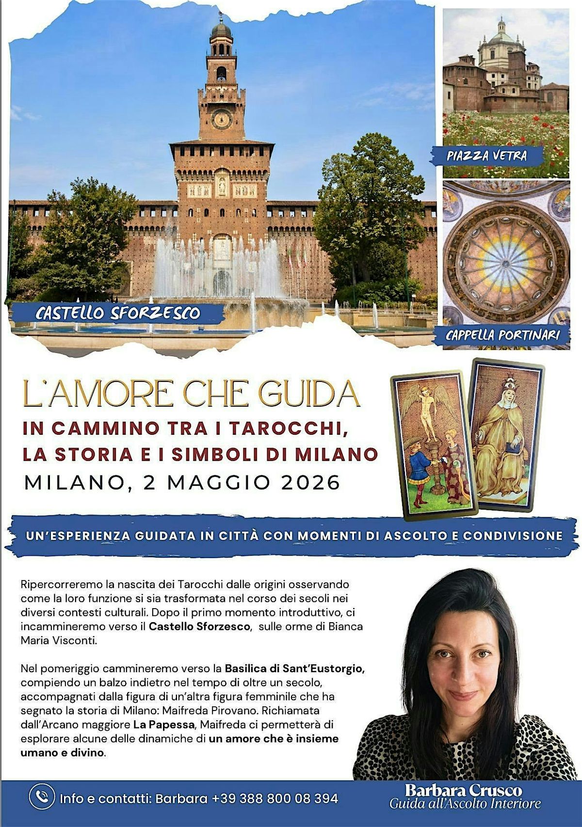 Nel pomeriggio cammineremo verso la Basilica di Sant’Eustorgio, compiendo un balzo indietro nel tempo di oltre un secolo, accompagnati dalla figura di un’altra figura femminile che ha segnato la storia di Milano: Maifreda Pirovano. Richiamata dall’Arcano maggiore La Papessa, Maifreda ci permetterà di esplorare alcune delle dinamiche di un amore che è insieme umano e divino.