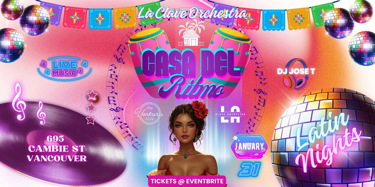 Join us at our favorite venue in Vancouver “VENTURA ROOM” as we bring you our LATIN NIGHTS on JANUARY 31st. La Clave Orchestra fills the space with a unique night of LIVE Salsa, Merengue & Cumbia 🎶 known as “CASA DEL RITMO "✨ Guaranteed to keep you dancing all night, featuring DJ JOSE T playing all the party anthems between sets including Latin, Urban, Reggaeton, Club Hits & much more!