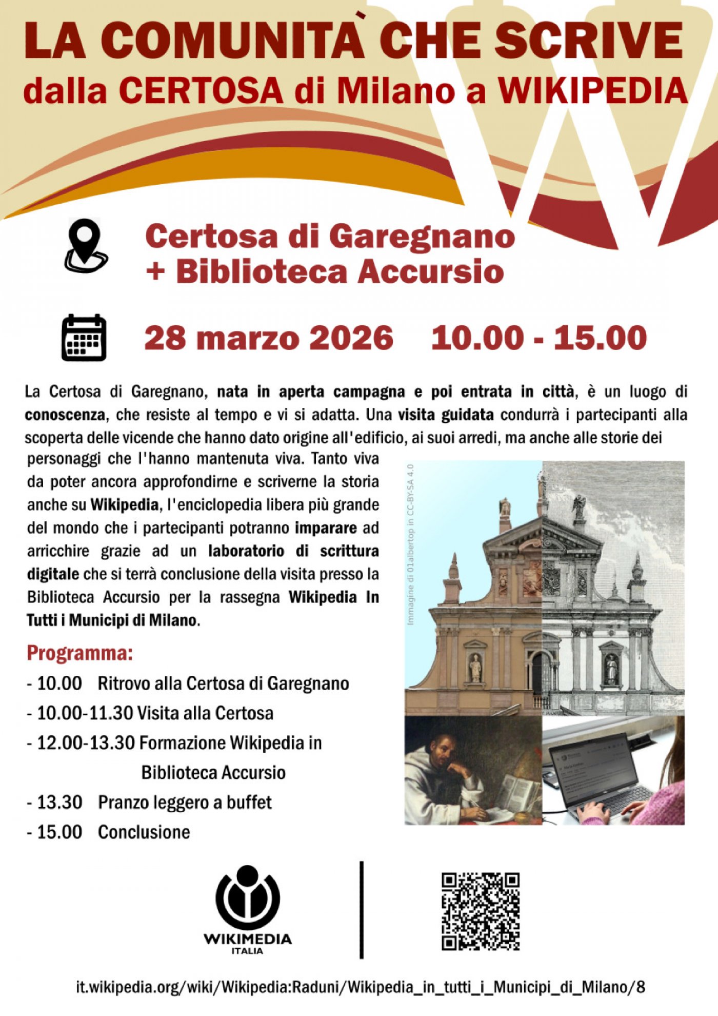 Sabato 28 marzo 2026 si terrà la visita guidata ed editathon "La Comunità che Scrive: dalla Certosa di Milano a Wikipedia", presso la Certosa di Garegnano, a Milano, seguita dall'editathon presso la Biblioteca Accursio, a prosecuzione della rassegna Wikipedia in Tutti i Municipi di Milano organizzata da Wikimedia Italia.