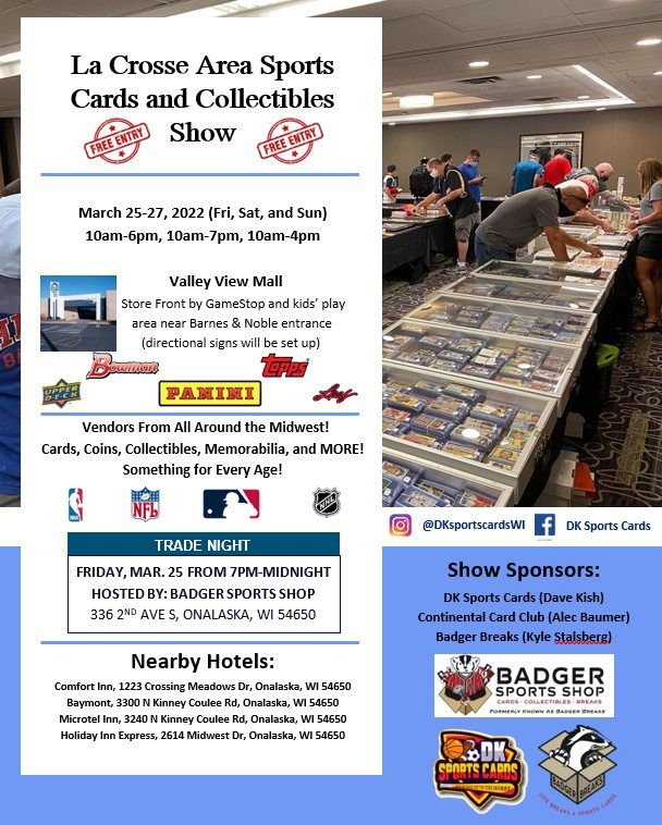 We are bringing back a sports cards, memorabilia, and collectibles show to the La Crosse area!Vendors from all around the Midwest will be in attendance to buy, sell, trade, and appraise items.