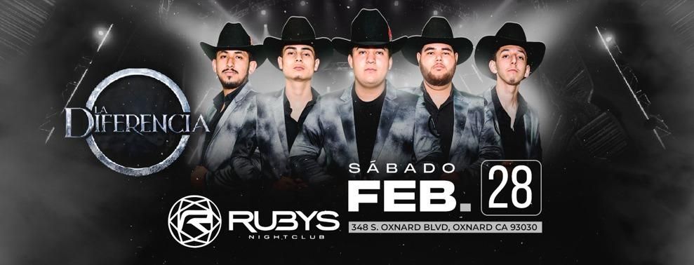 Experience the exciting event 'LA DIFERENCIA' at Ruby`s Night Club, Oxnard, CA, United States. This must-attend gathering promises an unforgettable experience for all attendees. Join us for a day filled with innovation, networking, and inspiration. Book your attendance today and be part of something extraordinary. #LADIFERENCIA #event #exciting #OxnardEvents #CAEvents