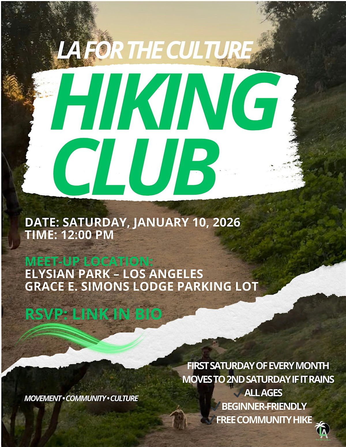 Join us for the LA for the Culture Hiking Club, a FREE, all-ages, beginner-friendly community hike happening the first Saturday of each month at different trails across the city.