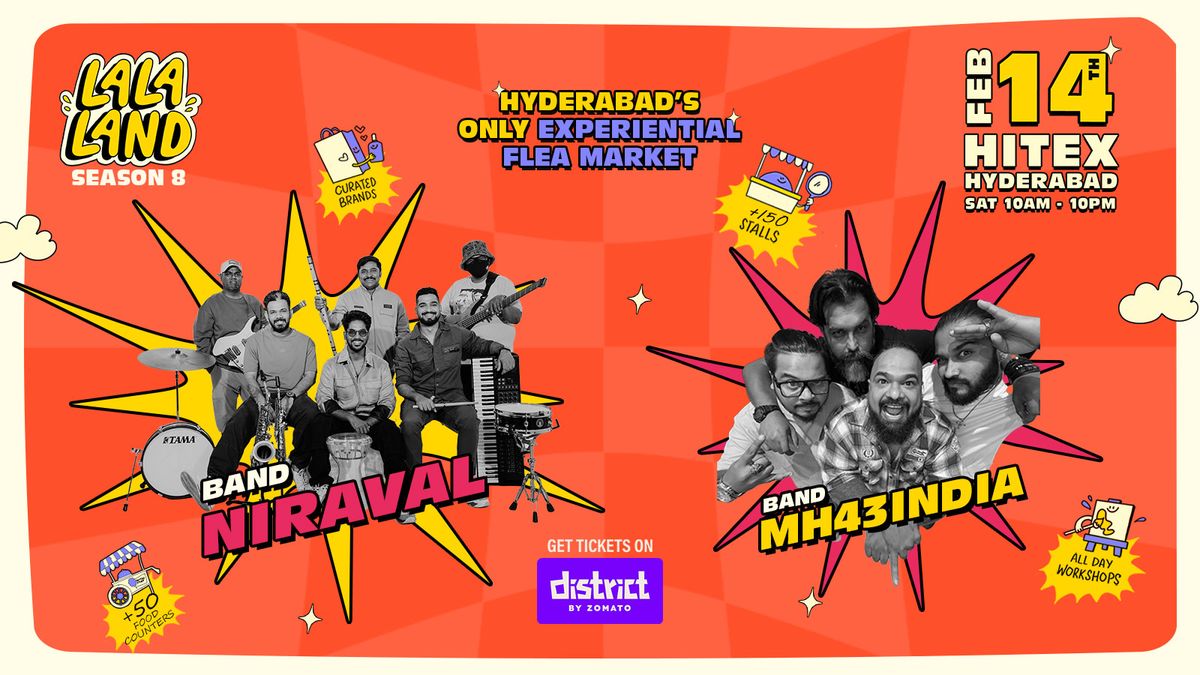 La La Land Flea returns with its latest edition—an experience in itself.A vibrant coming together of music, shopping, food, and feel-good festival energy.🎶 Music & Live PerformancesBand Niraval, one of Hyderabad’s most loved regional bands, along with more artists joining the lineup.Band MH43, Mumbai's premier Rock band playing thumping Bollywood music🛍️ A Shopper’s ParadiseExplore 150+ curated brands offering clothing, footwear, accessories, and lifestyle finds—handpicked to give shoppers a diverse and exciting retail experience.🍔 Food & DrinksIndulge in flavours from 50+ food joints, featuring experimental dishes, fusion cuisine, and festival favourites from some of Hyderabad’s top restaurants.🎠 Games, Kids Zone & WorkshopsWhile you shop and unwind, kids can enjoy a dedicated Kids Zone with a trampoline and a variety of fun games, along with engaging workshops for all ages.🌿 Happy, Sassy VibesSoak in the lush green surroundings, cool breezes, great music, and an atmosphere full of colour and joy—perfect for spending a relaxed, cheerful day out.La La Land Flea is where shopping meets music, food meets fun, and good vibes are always guaranteed.