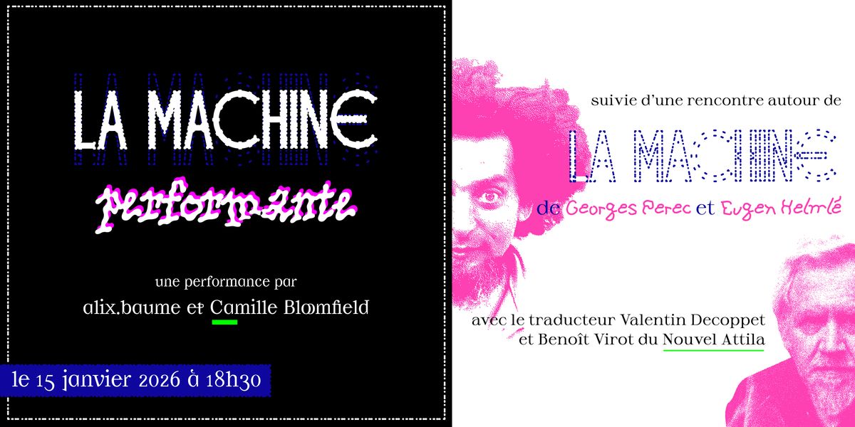 19h00 - table ronde animée par Denis Cosnard en présence d'alix.baume, Camille Bloomfield, Valentin Decoppet (traducteur) et Benoît Virot (éditeur au Nouvel Attila) autour de La Machine & La Machine mise à jour (parution 2025)
