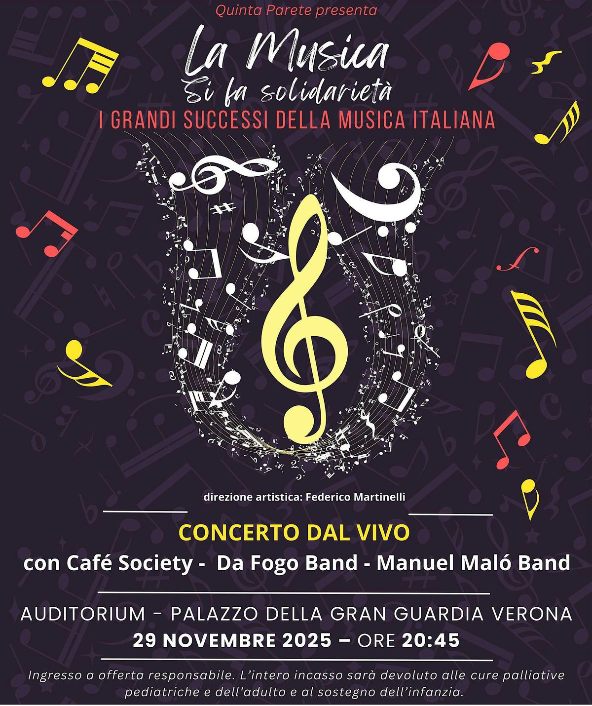 Un concerto dal vivo con i più grandi successi della musica italiana. 3 gruppi per due ore di divertimento a sostegno dell'Infanzia.