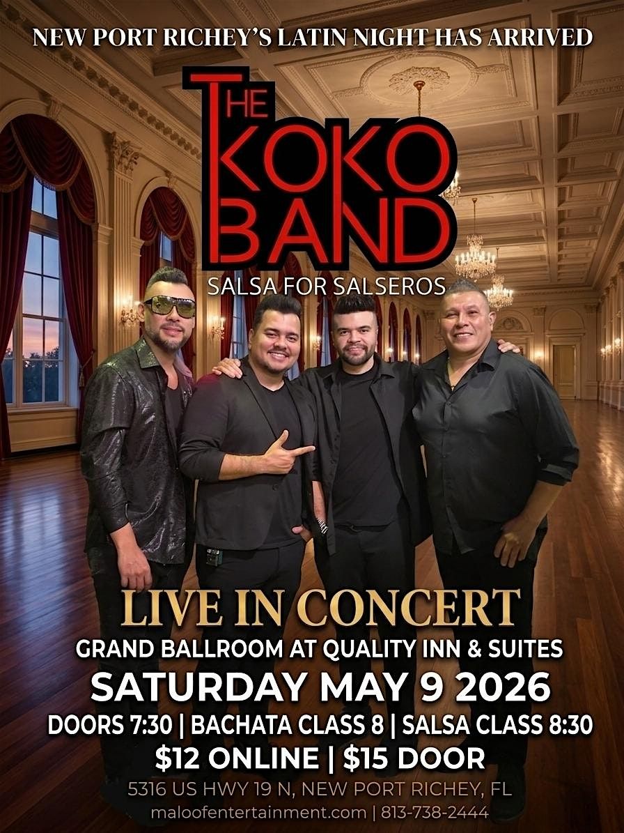 Doors open at 7:30 PM. Elba leads complimentary Traditional Bachata at 8 PM for anyone who wants to move before the floor fills. Jenny follows with complimentary Salsa styling at 8:30 PM. DJ Mike Sensation takes over at 9 PM and does not let go. Then Koko Band, directed by Jorge Escalante, takes the stage and plays the kind of live Salsa that makes a room stop talking and start feeling.