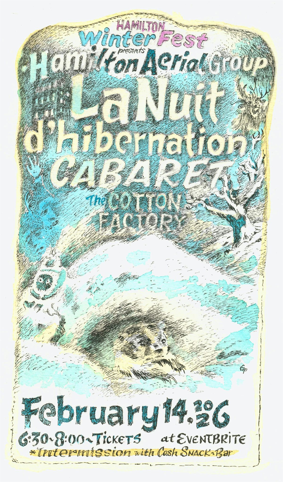 Hamilton Winterfest presents HAG’s annual Winterfest Cabaret. Hamilton Aerial Group is a circus collective who have been performing in and around Hamilton since 2010. Their first cabaret in 2015 was a huge success with a sellout of 600 tickets! Since then, their cabaret style Winterfest performances have morphed into true narrative theatre using aerial skills, stilt walking, puppetry and live music. This year HAG goes back to their cabaret style theatre, welcoming performers and musicians outside the collective to perform in the cabaret style narrative.
