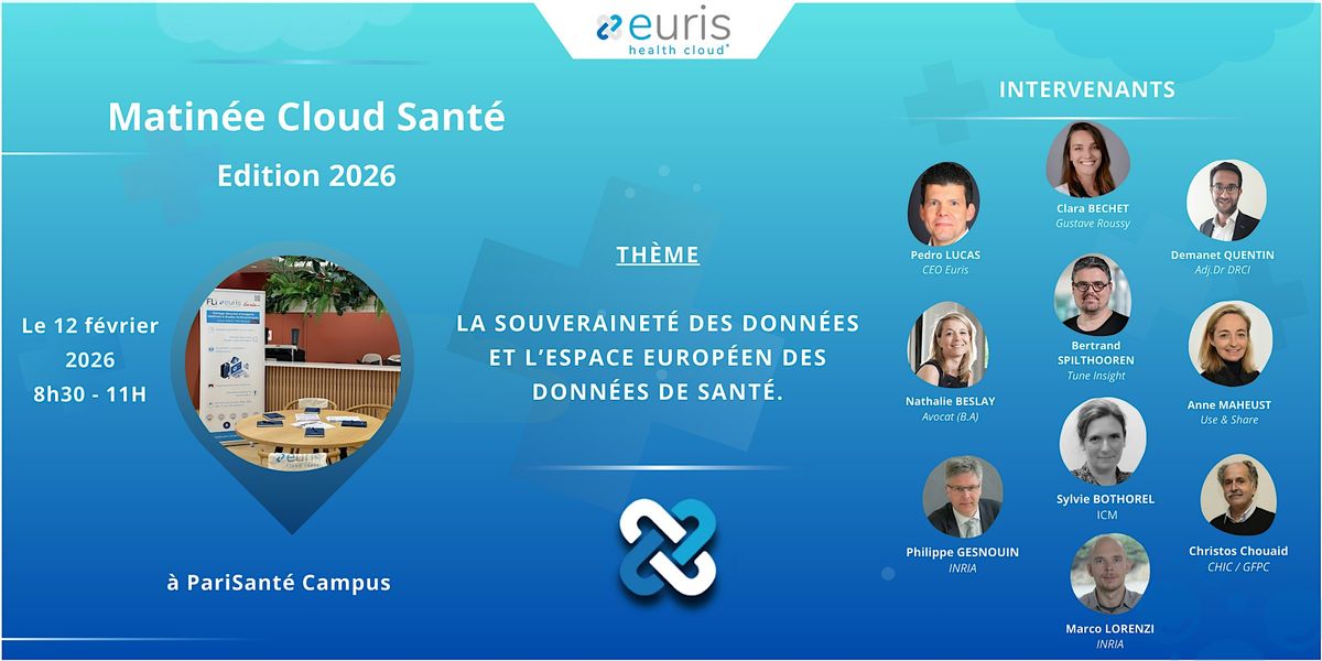 Dans le cadre de ses activités d’échanges et de découvertes dédiées à la réutilisation et la valorisation des données de santé, Euris vous convie à sa prochaine Matinée Cloud Santé qui se tiendra le 12 février 2026 à PariSanté Campus, sur le thème de La souveraineté des données et l’espace européen des données de santé.