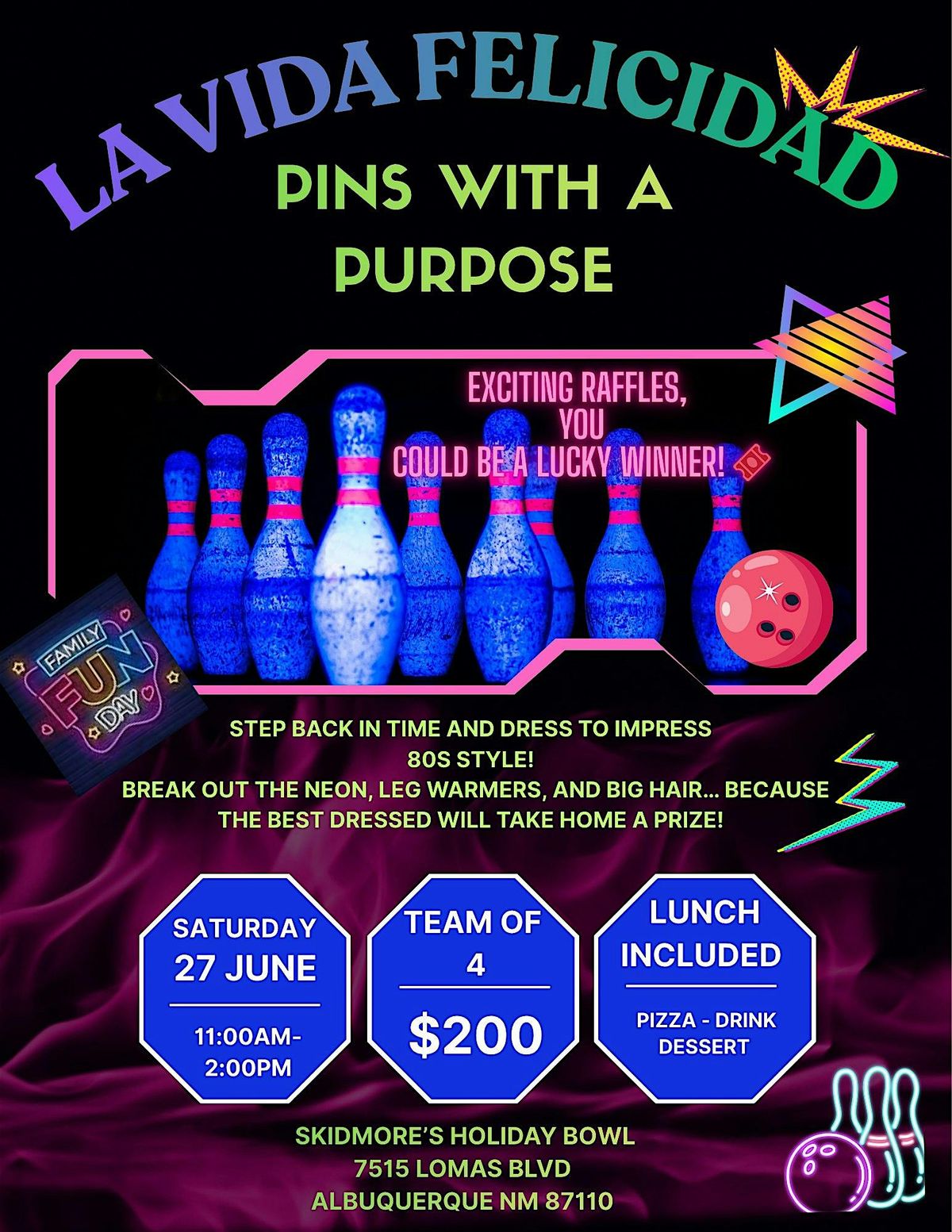 La Vida Felicidad invites the community to participate in Pins With a Purpose, a fun-filled bowling fundraiser designed for teams and families. The event takes place on Saturday, June 27, from 11:00 a.m. to 2:00 p.m. at Skidmore’s Holiday Bowl, located at 7515 Lomas Blvd NE, Albuquerque, NM 87110.