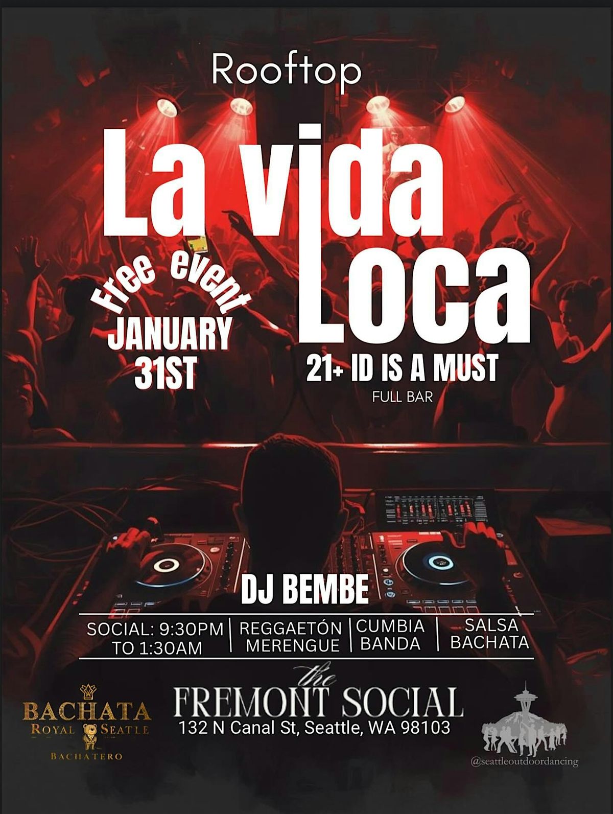 ROOFTOP LA VIDA LOCA LATIN NIGHT JAN 31 | 9:30PM - 1:30AM 132 N Canal St, Seattle DJ BEMBE spinning REGGAETÓN, MERENGUE, CUMBIA, BANDA, SALSA & BACHATA! FULL BAR | 21+ | ID REQUIRED Don’t sweat the cold — rooftop is fully covered & heated! Stunning views + beautiful vibes = BEST LATIN PARTY IN SEATTLE!
