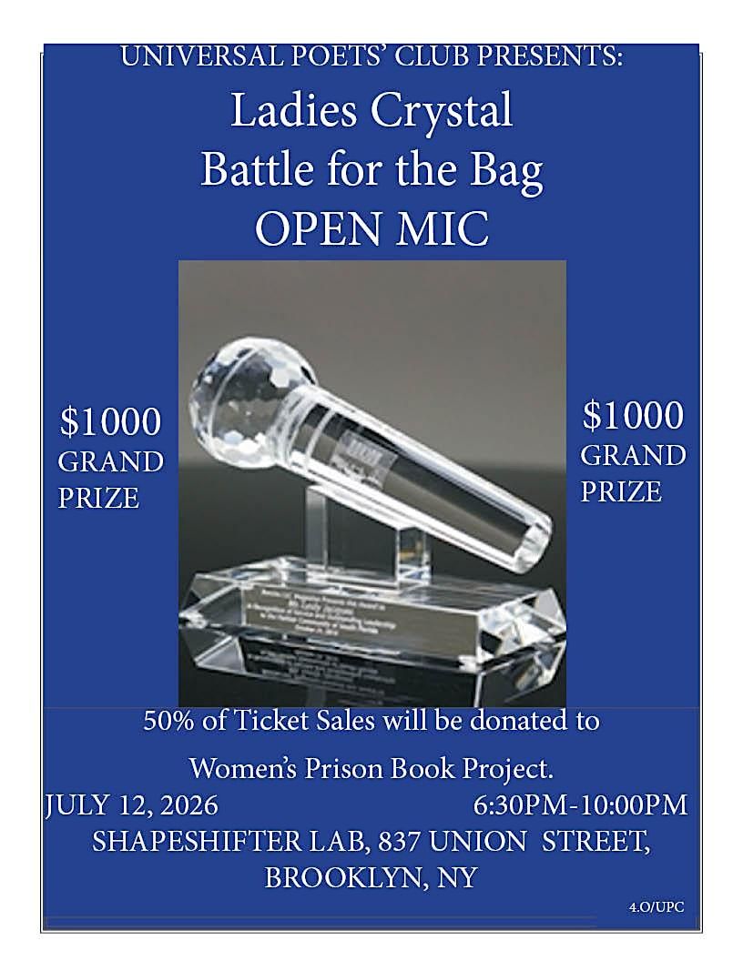Join Universal Poets' Club to supoport Women's Poetry, as women come together in poetry to celebrate Women's Healing & Spiritual Growth at this 1st Annual Ladies Crystal Open-Mic Celebration. 50% of Ticket Sales will be donated to the Women's Pr*son Book Project. Attendees will receive a quartz crystal pendent as UPC's special gift for your part in helping UPC sponsor its first annual charitable contribution to women's health & wellness.