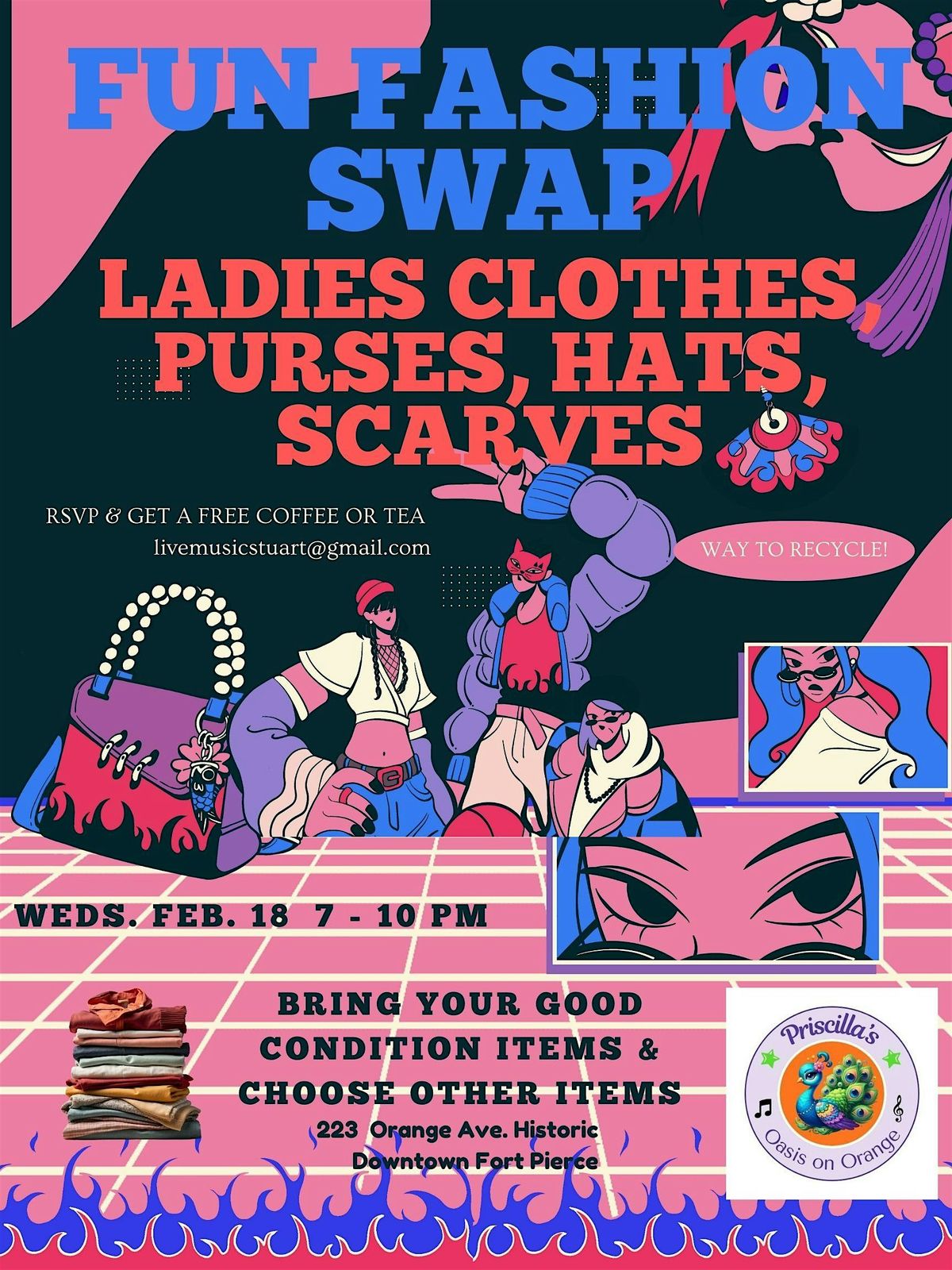 PRISCILLA'S OASIS ON ORANGE is a very cool one of a kind social spot combining a coffee house, mocktail bar, event space and live music venue and trinket shop all rolled into one! Come discover this neat place, bring good condition used clothes and accessories (no shoes or jewelry) and take something home! FREE TO ATTEND, beverage purchase required. Easy free parking in garage just a few steps west of the venue... Your eventbrite ticket is your rsvp, thank you!