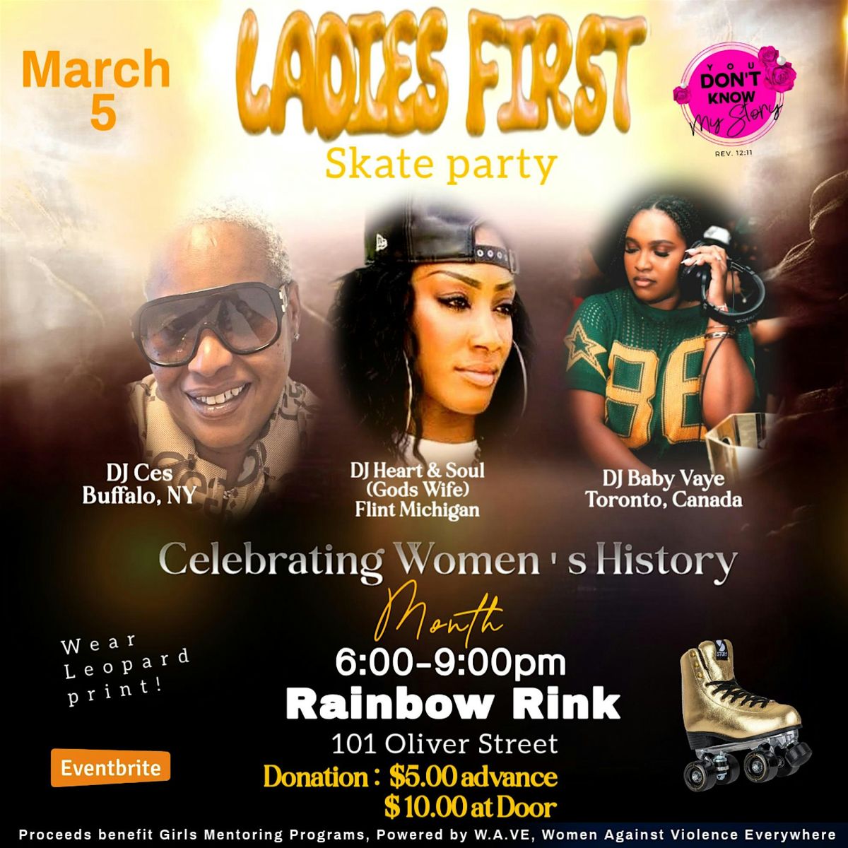 Ladies First! Rollerskate Fellowship Party Celebrating Womens History Month. 3 Dope female DJs, Skate Routine and Fun. Wear Leopard print!