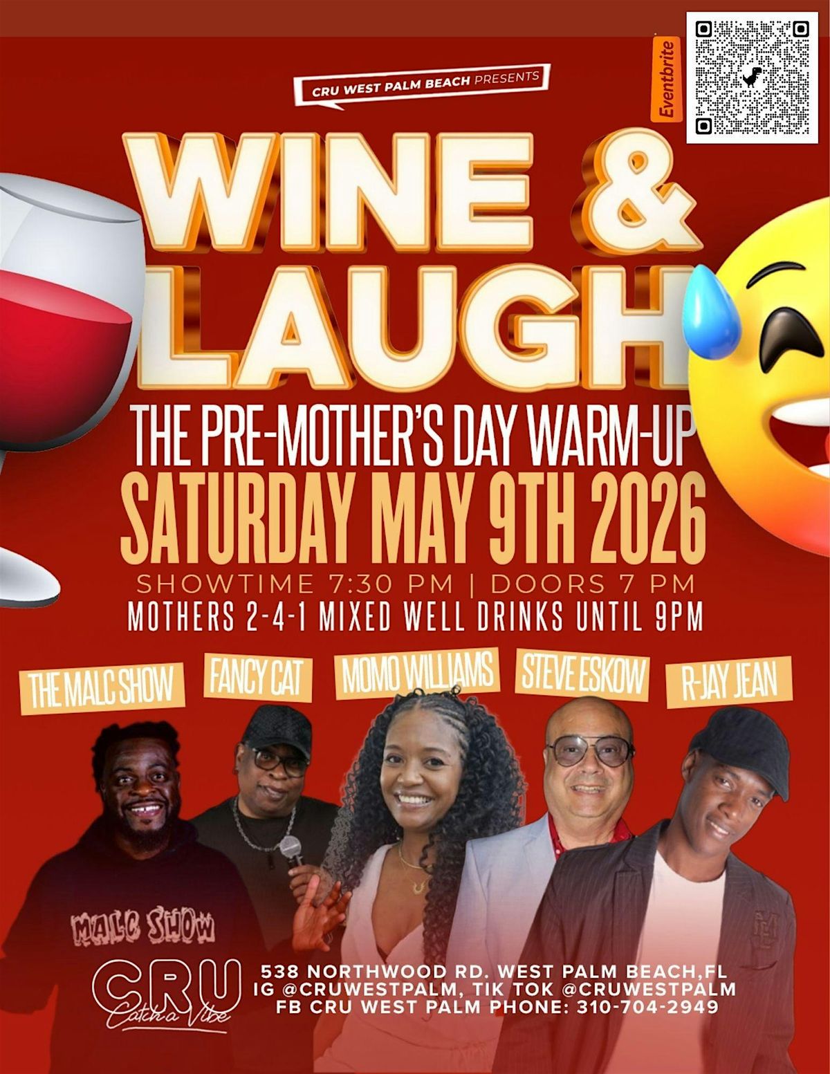 Pre–Mother’s Day adult comedy night, Wine & Laugh, at CRU West Palm Beach on May 9th, 2026.