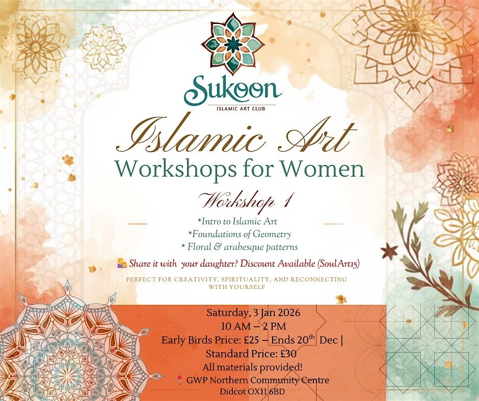 Join our Islamic Art Workshop .You'll enjoy : An intro to Islamic Art, Basics of geometric patterns ,Creating your own meaningful artwork