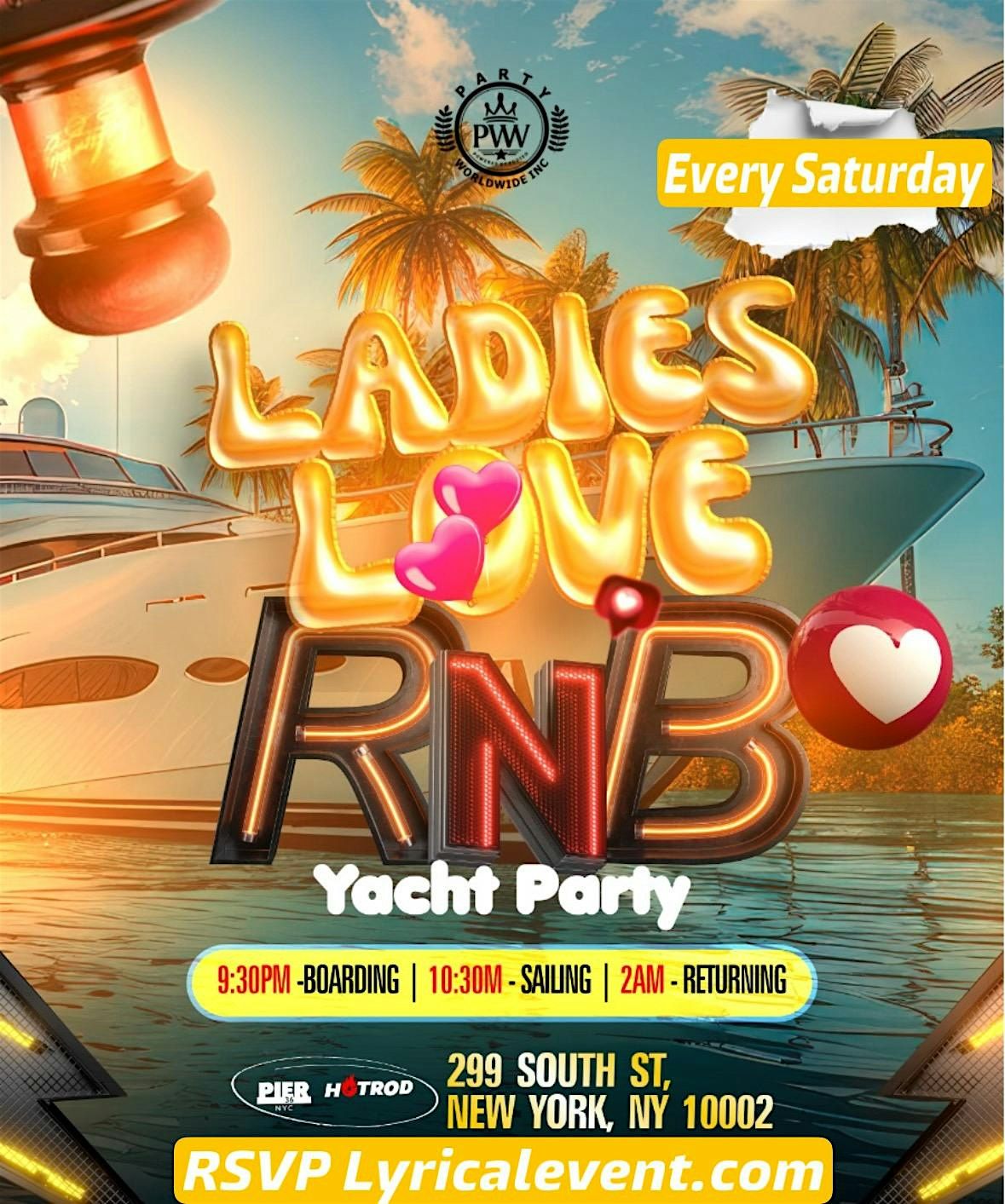Welcome aboard, music lovers! Get ready for an unforgettable night at Ladies Love R&B On A Yacht NYC happening at Pier 36 NYC. Join us for a cruise filled with smooth R&B tunes and good vibes. Let's sail away into the night as we groove to the rhythm of our favorite hits. Don't miss out on this one-of-a-kind experience!