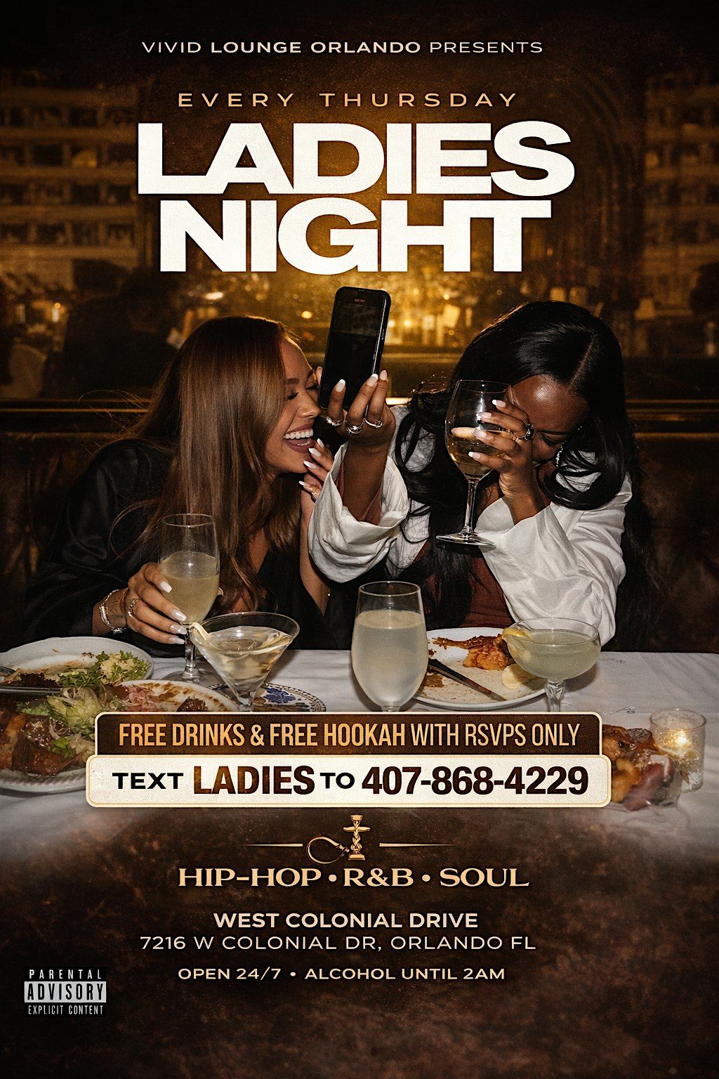 Join us at VIVID SMOKE SHOP/ VIVID LOUNGE ORLANDO for an unforgettable Ladies Night! Enjoy free drinks and hookah in a chill vibe. It's happening EVERY THURSDAY at 10:00 AM (Eastern Time). Bring your friends and let's make it a night to remember!