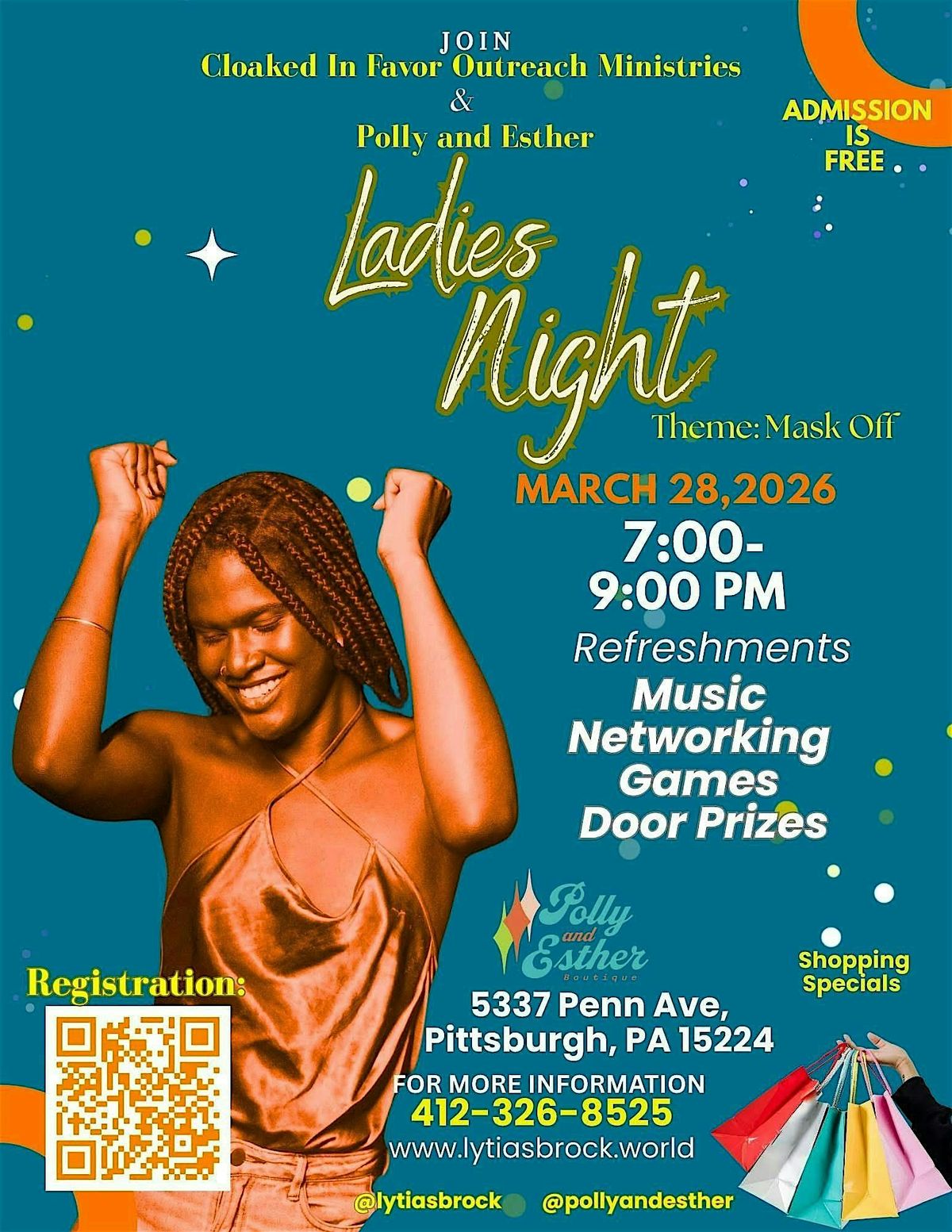 Ladies, it’s time to take the mask off.Join us for Ladies Night Out 2026: MASK OFF, an unforgettable evening designed to create space for authenticity, connection, and joy. Hosted by Cloaked In Favor Outreach Ministries in partnership with Polly and Esther clothing store, this special night invites women to show up as they are—unfiltered, unguarded, and unapologetically themselves.This is more than a night out. It’s a moment to breathe, laugh, connect, and let your hair down in a supportive, faith-filled atmosphere where you don’t have to perform or pretend.What to Expect:Refreshments