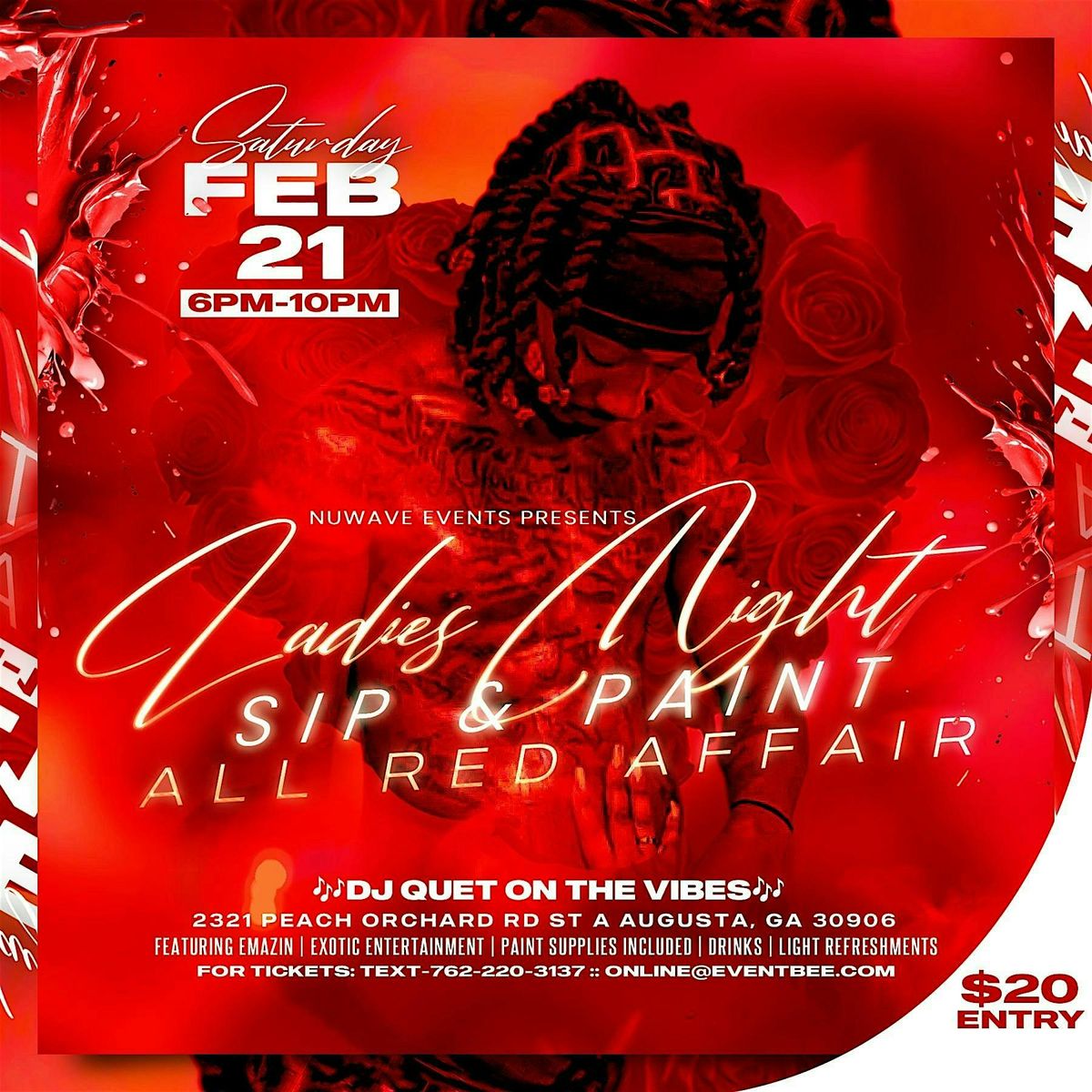Hey ladies! Ready for a fun night out? Join us for Ladies Night Sip&Paint All Red Affair, an awesome event where you can unleash your creativity while sipping on your favorite drinks and enjoying exotic entertainment. Whether you're a pro or just wanna have some laughs with friends, this night is all about good vibes, great art, and lots of fun. Bring your besties and let's make some colorful memories!