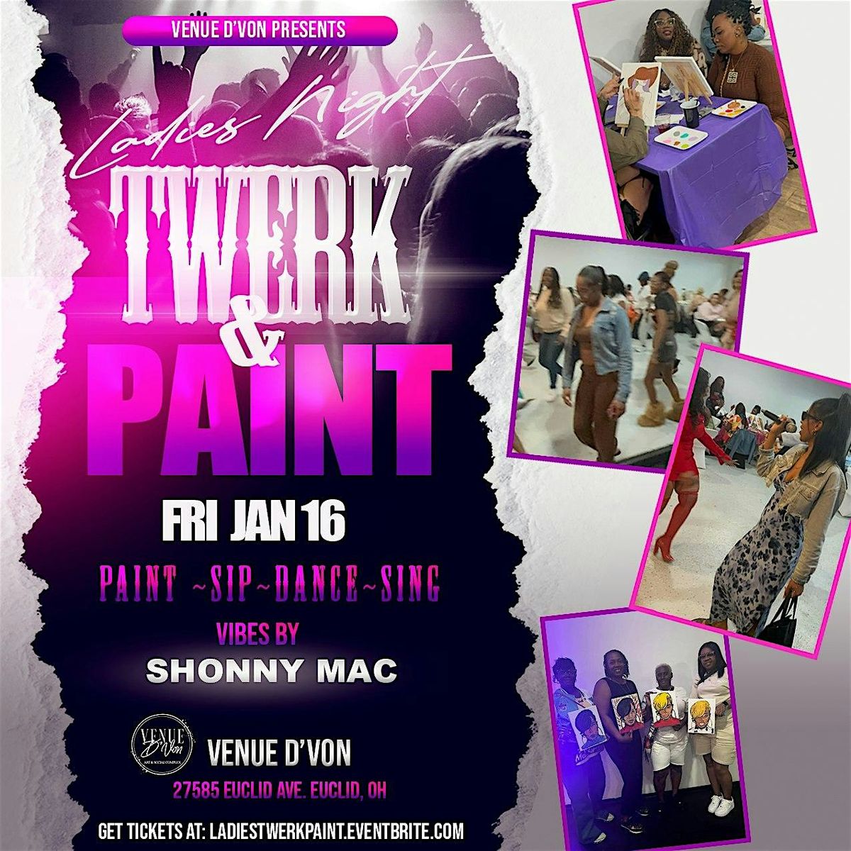 Welcome to Ladies Night Twerk, Paint & Sing at Venue D'Von! Ladies get ready to dance & sing your favorite Hip Hop, Reggae, & R&B favorite hits while unleashing your inner artist. Join us at Venue D'Von for a fun-filled evening of painting, twerking, line dancing & Karaoke fun!! 🎨 Enjoy small bites, beverages , & complimentary wine (courtesy of Tha Empire Ent. with all The Vibes provided by The King of tha Vibes.. DJ Shonny Mac !!! 🔈So, Ladies grab your friends and dont miss out on this unique blend of music, art, and good vibes! (Fellas are welcome also)