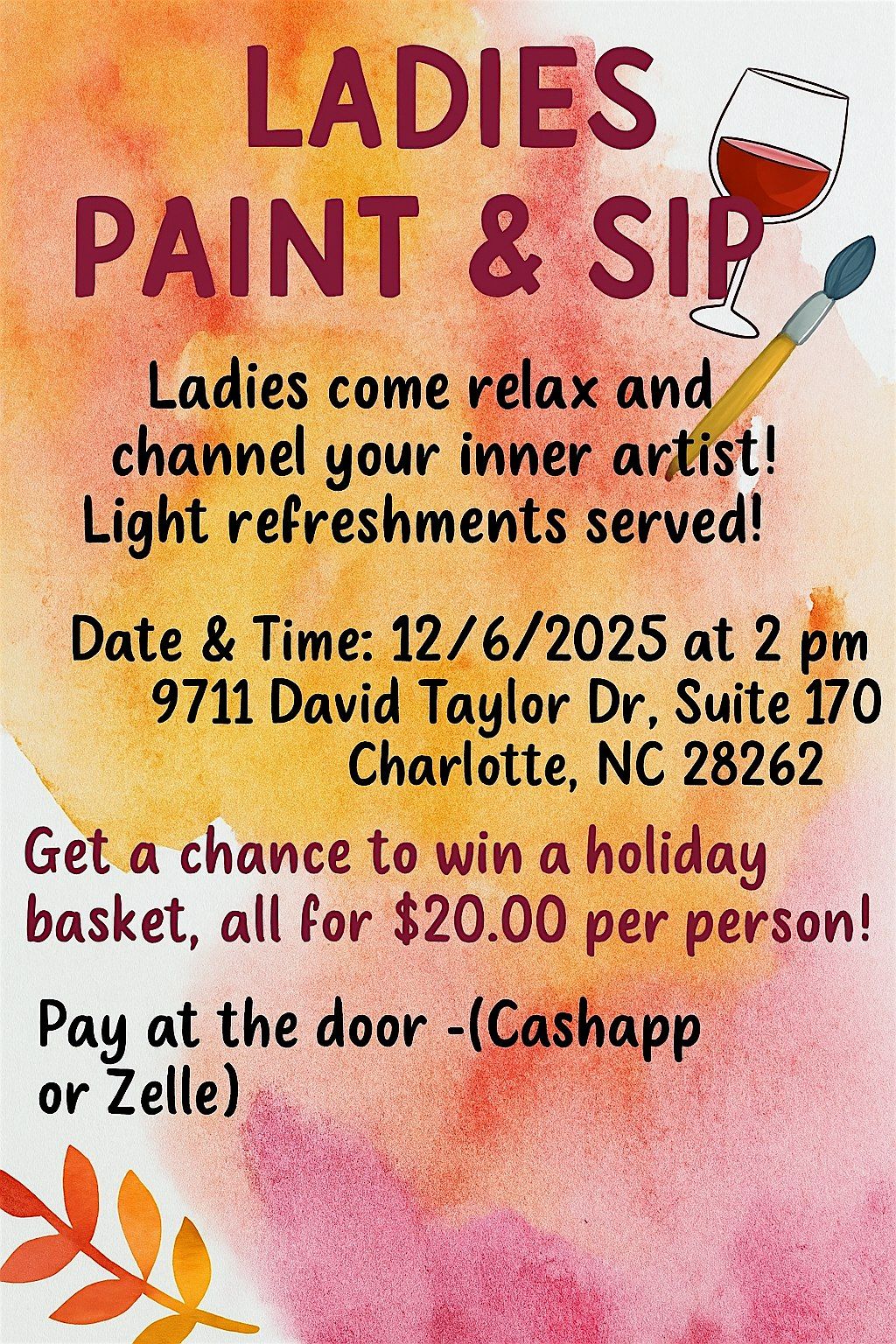 Calling all ladies ! Before the holidays kick into gear, take time relax and enjoy a fun filled afternoon! Whether you are seasoned at " Paint and Sip" or not come have fun. For only $20.00 you get to take a master piece home !