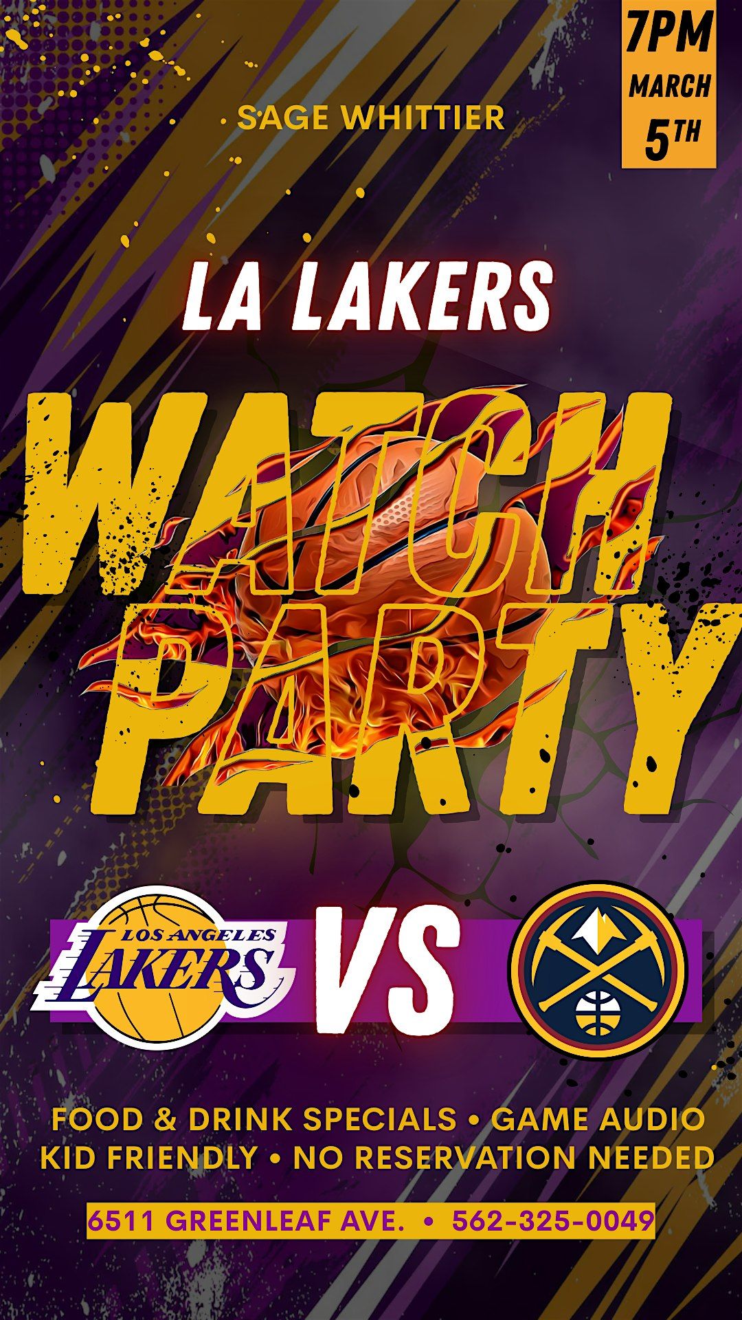 Watch LA Lakers take down the Chicago Bulls at Sage Whittier! Food & Drink specials, big screens, kid-friendly, doors open at 3PMAbout this Event