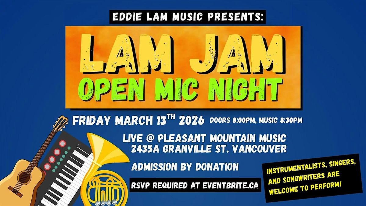 We welcome musicians of all levels incuding beginners, rock stars, and everywhere in between. Whether you're a singer, songwriter, or even an instrumentalist, the Lam Jam is all about YOU coming up on stage having a good time playing music in a supportive environment. You're welcome to jam with other performers if given permission. It's all ages, so students, seniors, and folks in between are invited! It's all taking place at Pleasant Mountain Music in Vancouver, one of the coolest music educational centres in the Lower Mainland. And who knows...there might be a performance or two from their instructors!