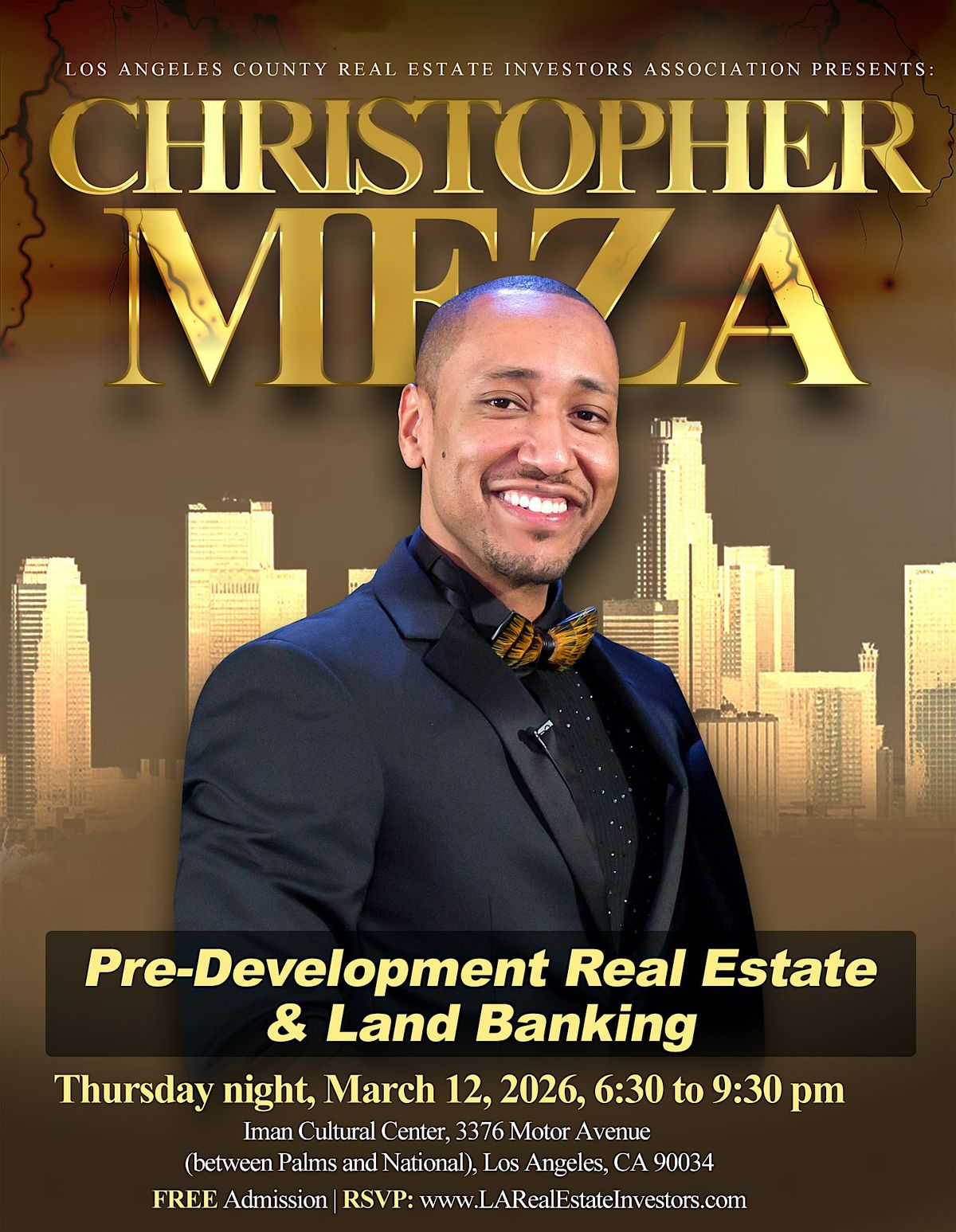 Special Guest Speaker. Our guest speaker will be Christopher Meza, the leading authority on Land Banking and pre-development real estate. He is a nationally recognized speaker and best-selling author. Chris was recently the keynote speaker with Steve Forbes (Chairman and Editor-in-Chief of Forbes Magazine), at the “Success in the New Economy” conference. Christopher has been interviewed on ABC, NBC, CBS, and several FOX affiliates across the country. Christopher will be our special guest at LAC-REIA’s February meeting. The title of Christopher’s presentation is “How to Find and Develop Pre-Development Real Estate for Land Banking.” RSVP now!