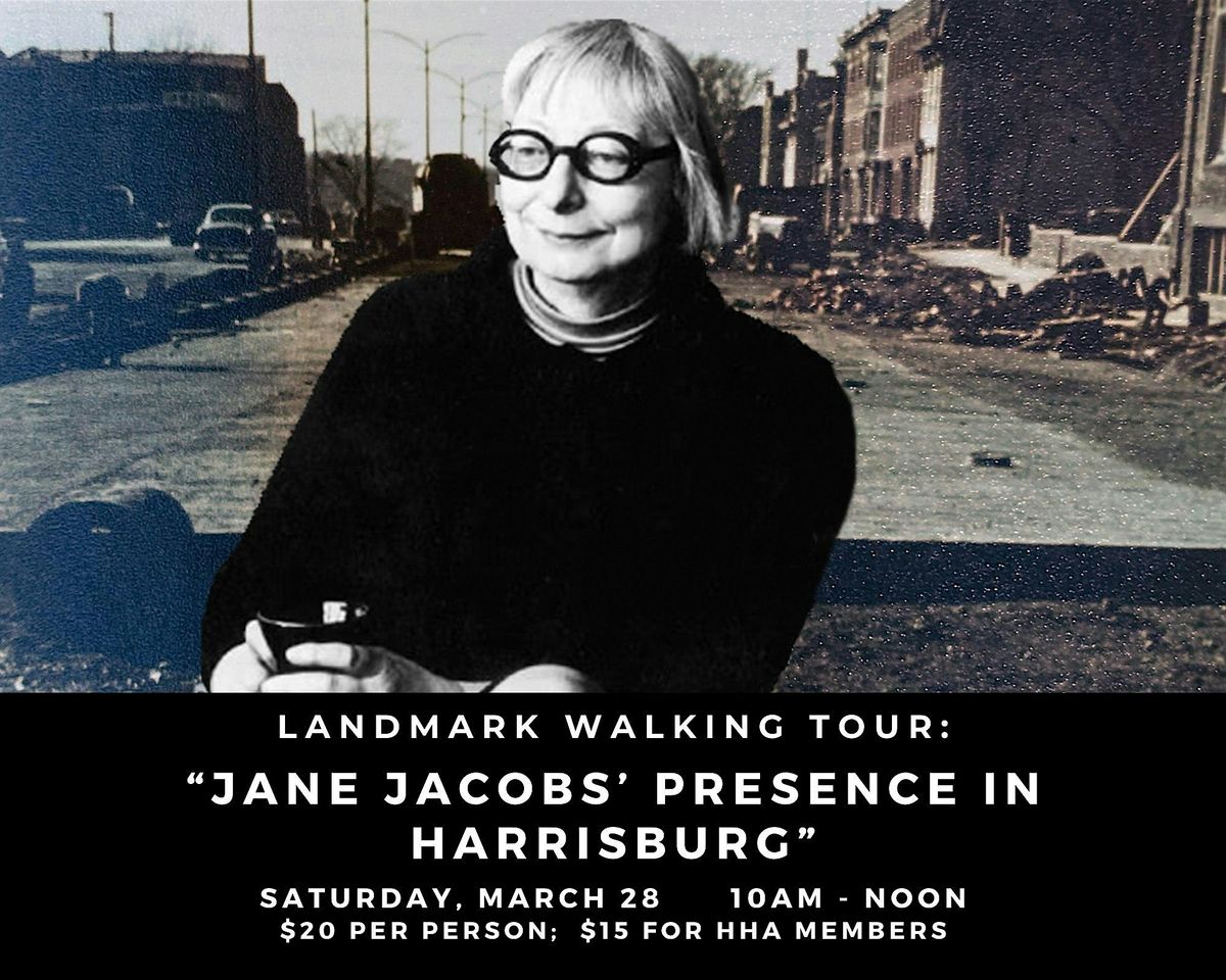 Landmark Walking Tour: Jane Jacobs Presence in Harrisburg, join Historic Harrisburg for a walk through the city as you examine successful examples of Jane Jacobs’ ideas on urban renewal and the impact on the local community and urban landscape. Tour will start at the Historic Harrisburg Resource Center (1230 N. 3rd), go through downtown to Chestnut St. and return to HHA. 10 AM to Noon.