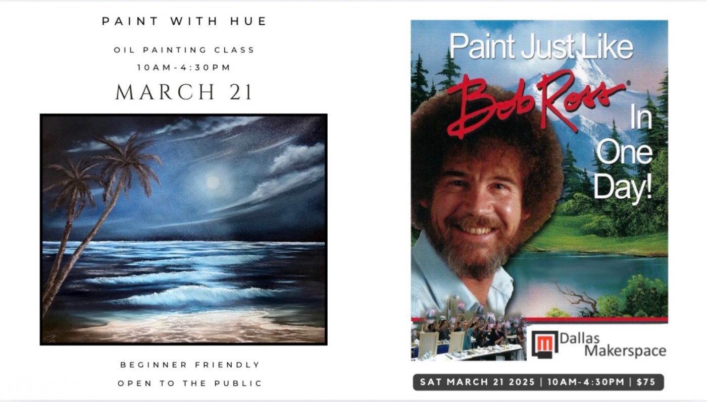 Come join us for a hands-on session oil painting where you can unleash your creativity and learn or practice techniques as we paint a landscape scene just like Bob Ross. Even beginners can use these wet on wet oil painting techniques used by well known painters like Bob Ross and Bill Alexander to create an oil painting they’d proudly hang on their wall in just one day!