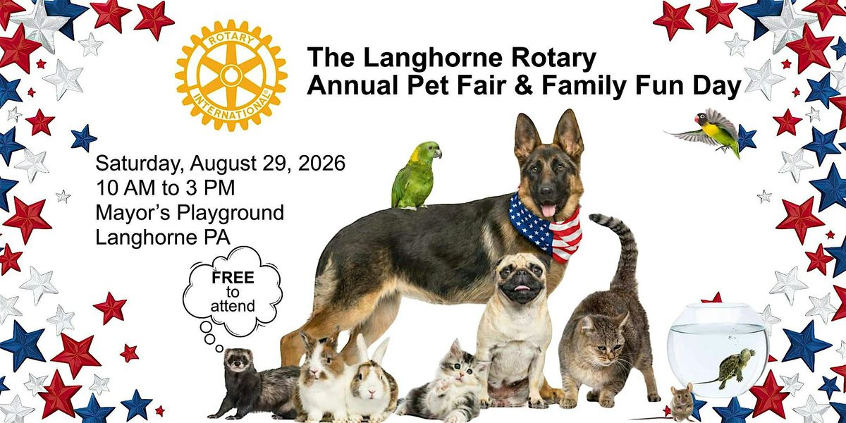 The Rotary Club of Langhorne's Pet Fair and Family Fun Day is one of the biggest events in the area. Don't miss your chance to be involved! 2026 will include an exciting kids' area with fun, new activities. We will have* a Petting Zoo, Exotic Animal tent and show, Air Slides, Pet Parade, and Pet Photo Booth!