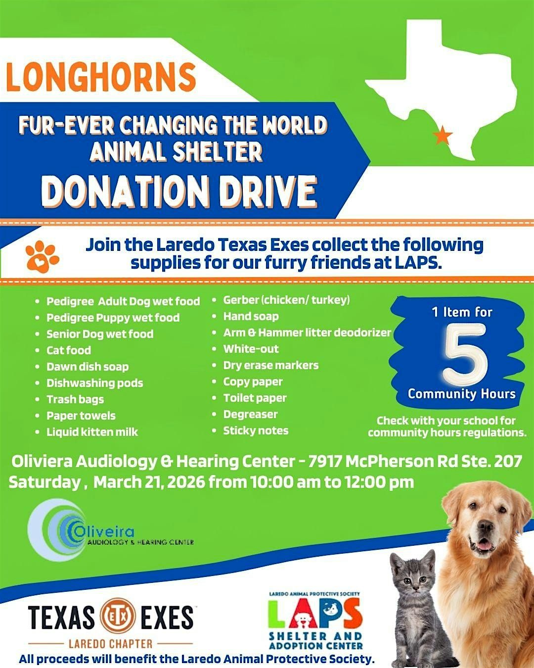 LAPS needs our help to care for all the animals in their local shelter. Choose any items from the list and bring them to our drive-thru collection event outside Olveira Audiology. Currently the most needed item at LAPS is wet dog food!