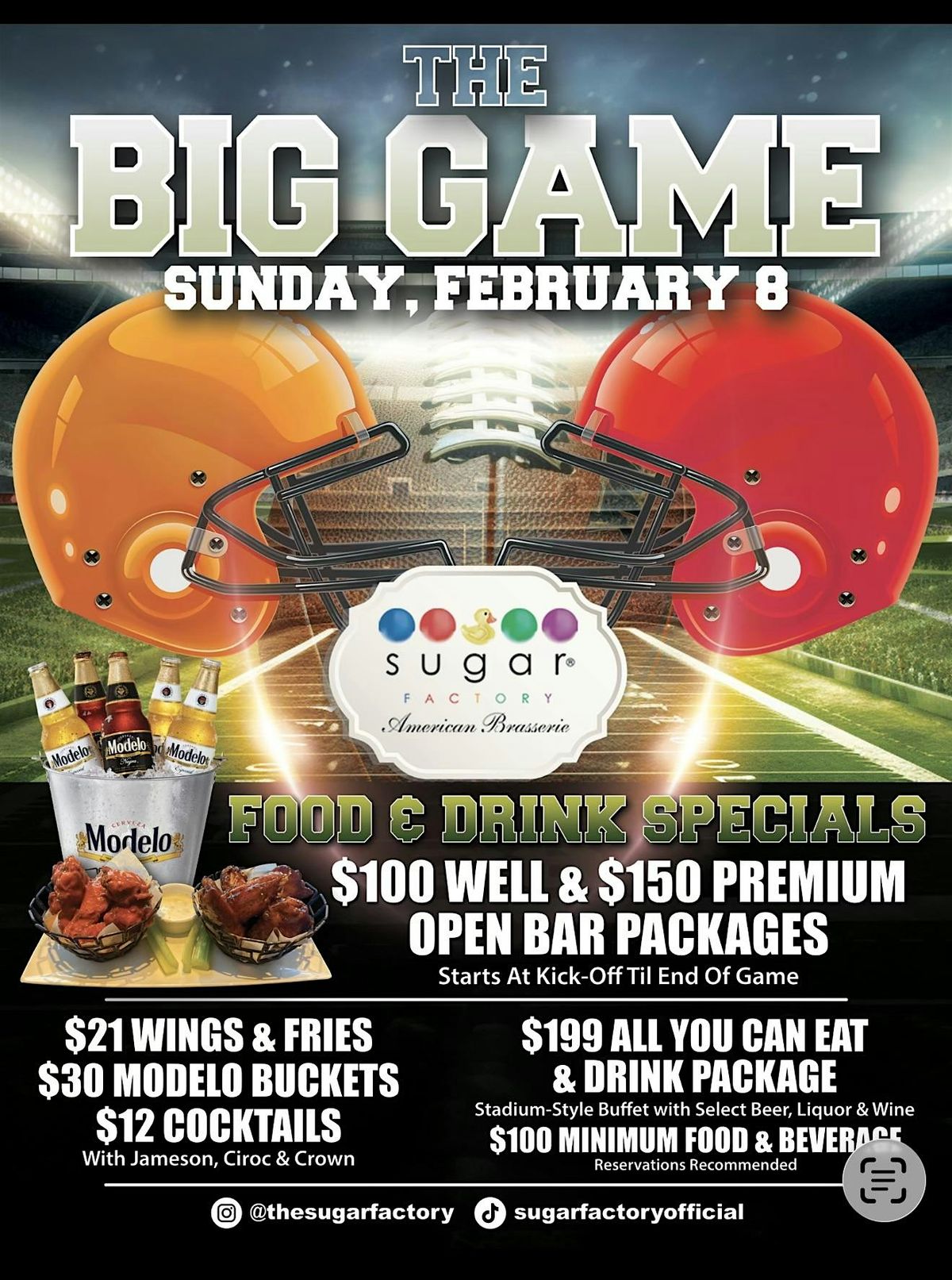 SUGAR FACTORY HOSTING SUPERBOWL PARTY ON THE 3rd with projector and 10 TVS … book now … NFL PLAYERS AND CELEBRITIES WILL BE IN THE BUILDING