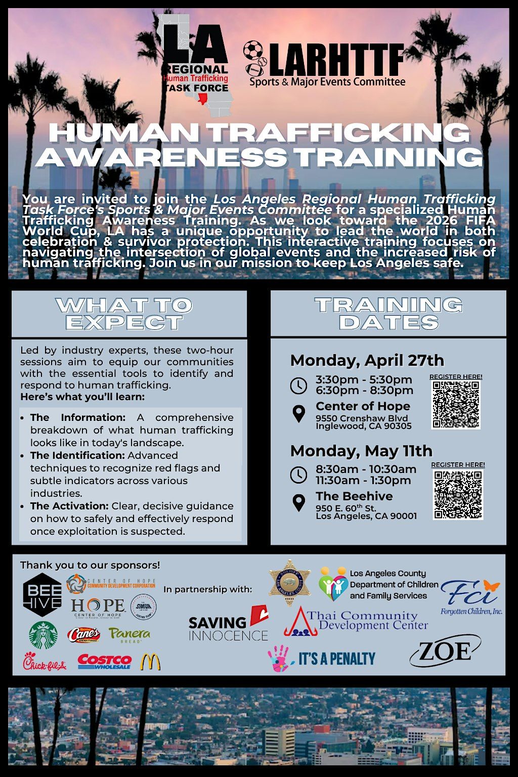 You are invited to join the Los Angeles Regional Human Trafficking Task Force's Sports & Major Events Committee for a specialized Human Trafficking Awareness Training. As we look toward the 2026 FIFA World Cup, LA has a unique opportunity to lead the world in both celebration & survivor protection. This interactive training focuses on navigating the intersection of global events and the increased risk of human trafficking. Join us in our mission to keep Los Angeles safe.