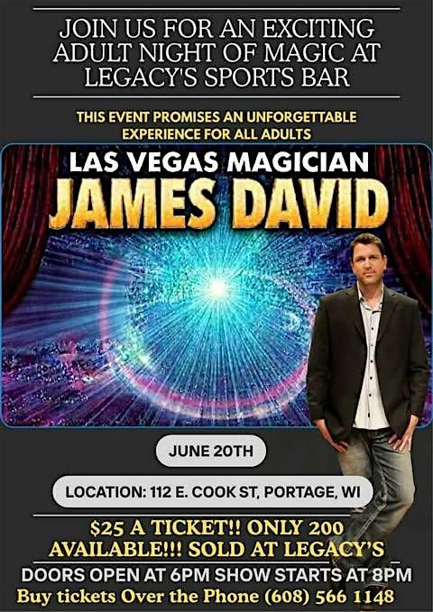 Vegas magician James David hits Legacy’s—wild, up-close magic that’ll mess with your mind. $25 tickets. Limited seating!About this Event