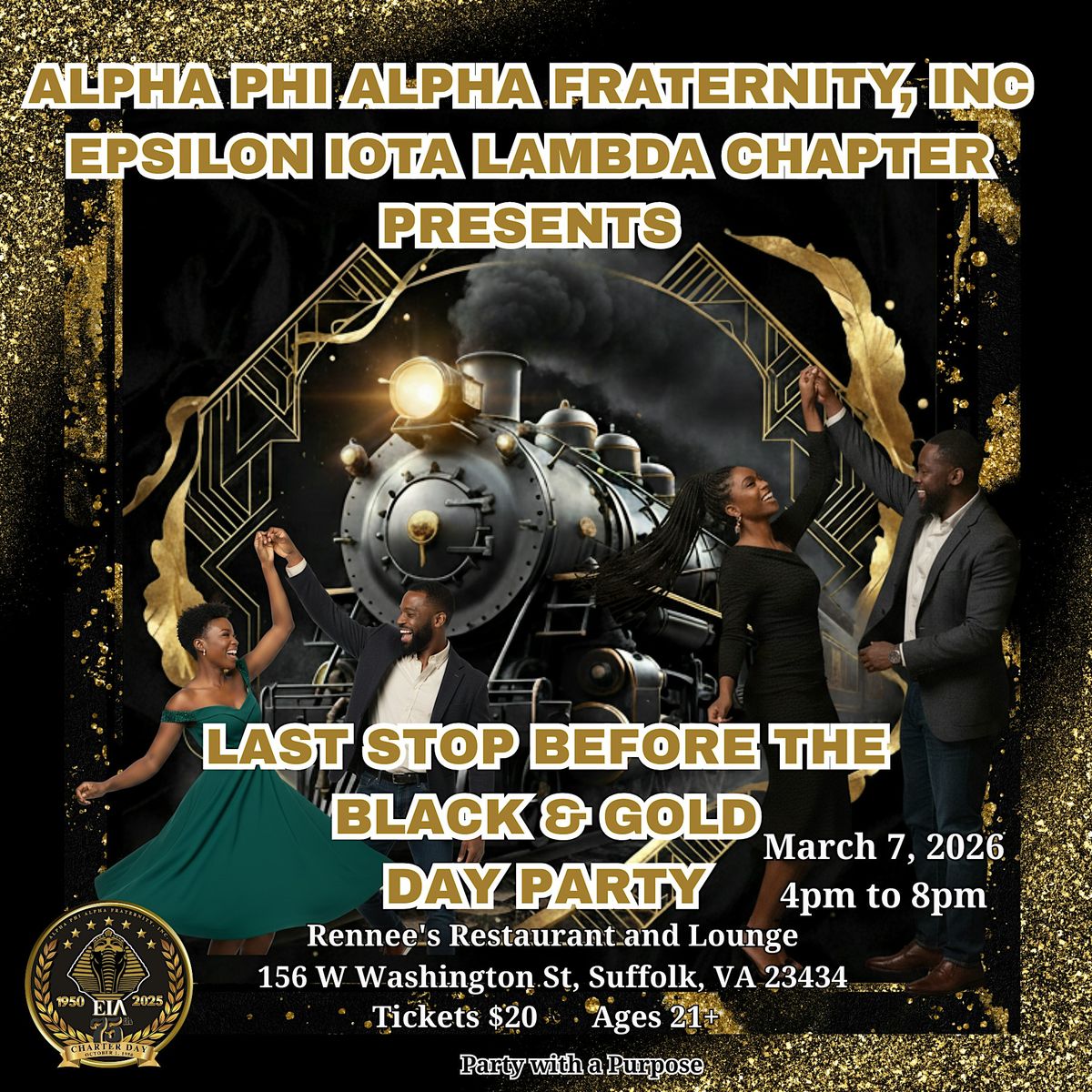 Join the Brothers of Alpha Phi Alpha Fraternity, Inc., Epsilon Iota Lambda Chapter for an unforgettable evening. We are bringing the energy to Suffolk for the "Last Stop Before The Black & Gold Day Party."