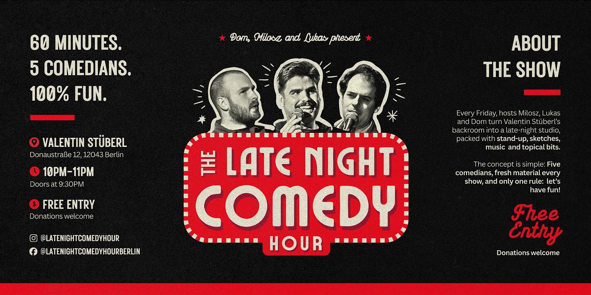 Every Friday, hosts Milo, Lukas and Dom turn Valentin’s smoky backroom into a late-night studio, packed with stand-up, music and topical bits inspired by Conan and Letterman.