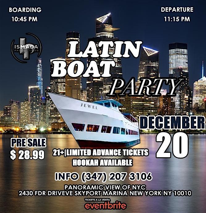 Join us on December 20 for an unforgettable Latin Boat Party aboard , with two floors of music, NYC panoramic views, and limitAbout this Event