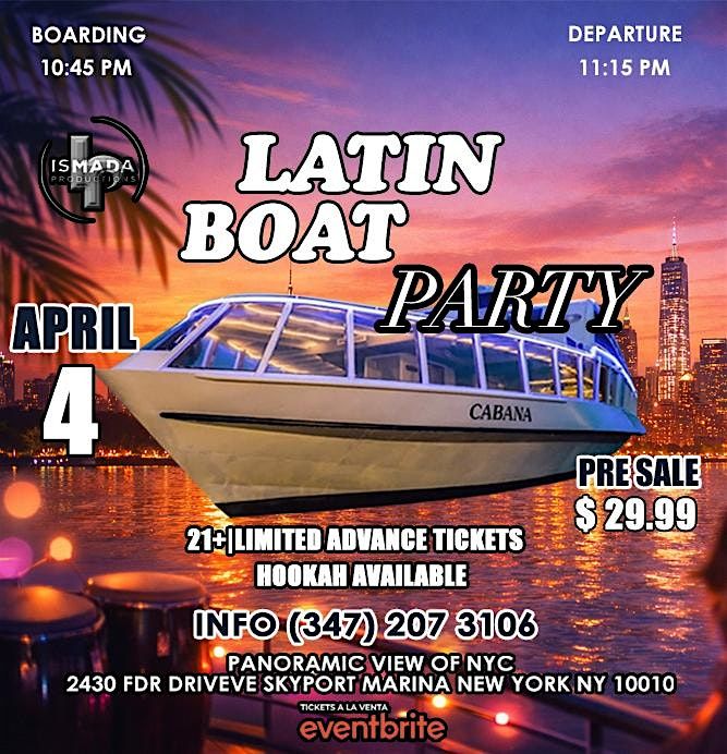 Join us on April 4 for an unforgettable Latin Boat Party aboard , with two floors of music, NYC panoramic views, and limitAbout this Event