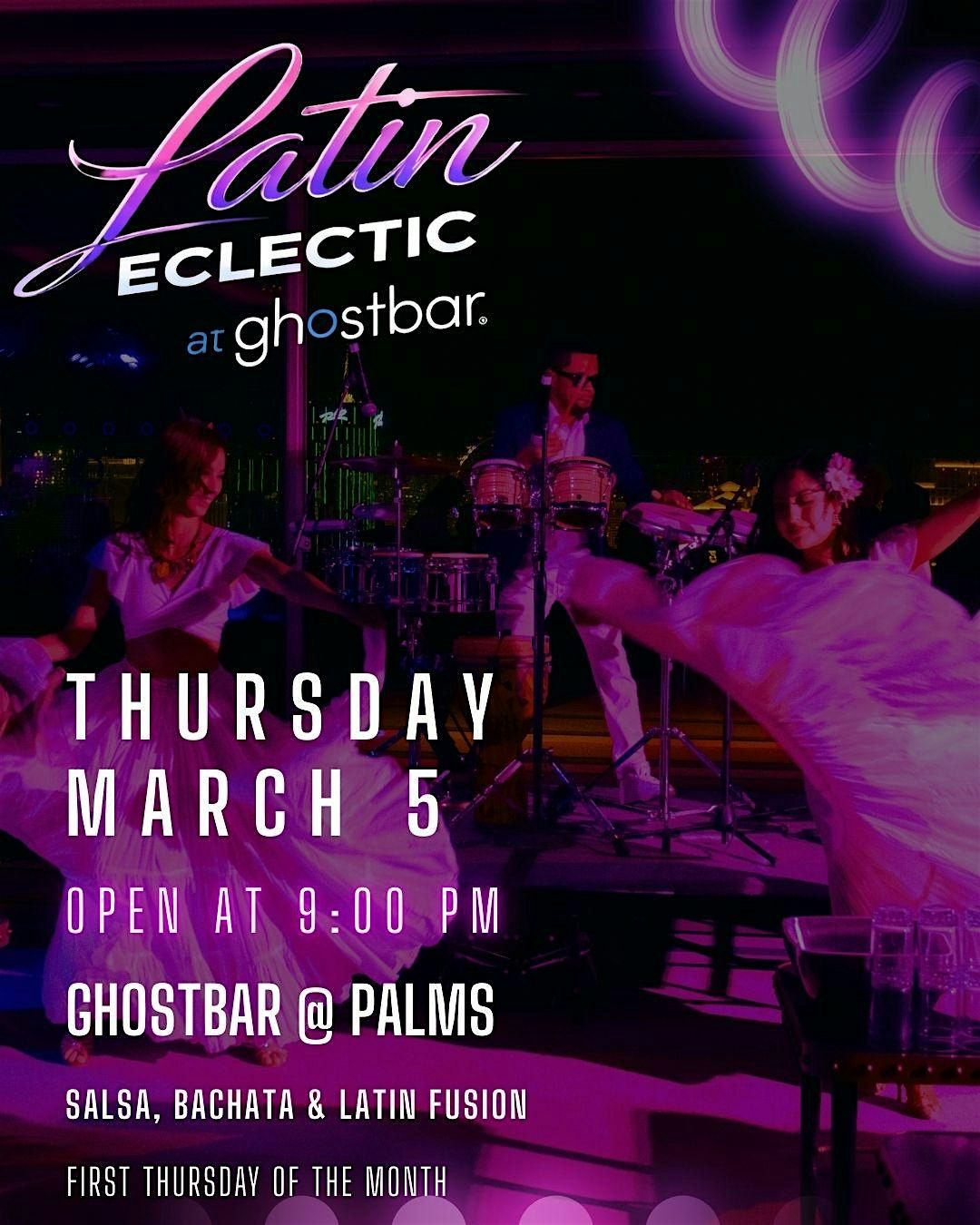 Come join us at Ghostbar for a night filled with Latin vibes and eclectic beats. Get ready to dance the night away under the stars every first Thursday !Savor delicious cocktails, mingle with fellow music enthusiasts, and enjoy stunning views of the city skyline. Don't miss out on this unforgettable rooftop experience! Free entrance