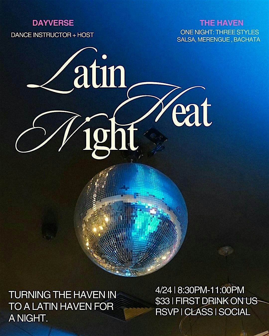 A new salsa experience is landing, but this time with more flavor, more space and bigger heights! This is your passport to Latin Heat night where we will also be learning bachata, salsa and merengue in one night, thirty minutes each style and then a social hour! Not your typical night, we will start you off with one drink with your ticket and you can keep drinking as you please after! Their Speakeasy restaurant is delicious, and its highly encouraged that you RSVP the 24th so you can stay after for dinner or when dancing is over at 10:00pm you can still have some time to enjoy their kitchen that opens late. If you want to keep the vibes going in the speakeasy they are open until late! Dont miss the opportunity to take in this location for everything they can offer... in the summer catch me on the rooftop :)