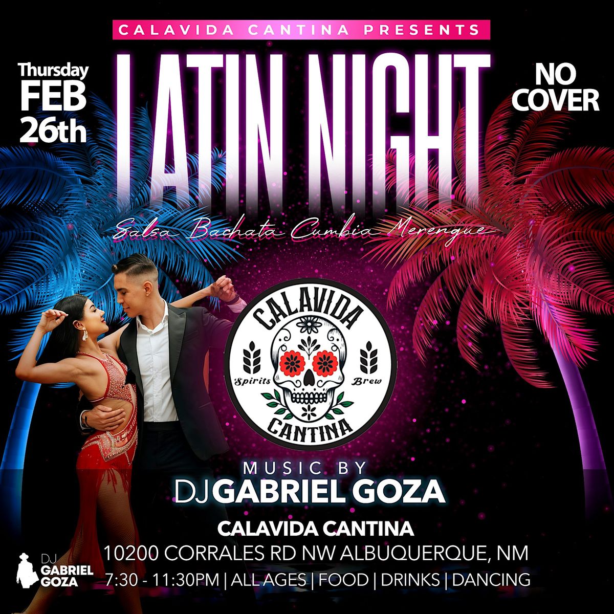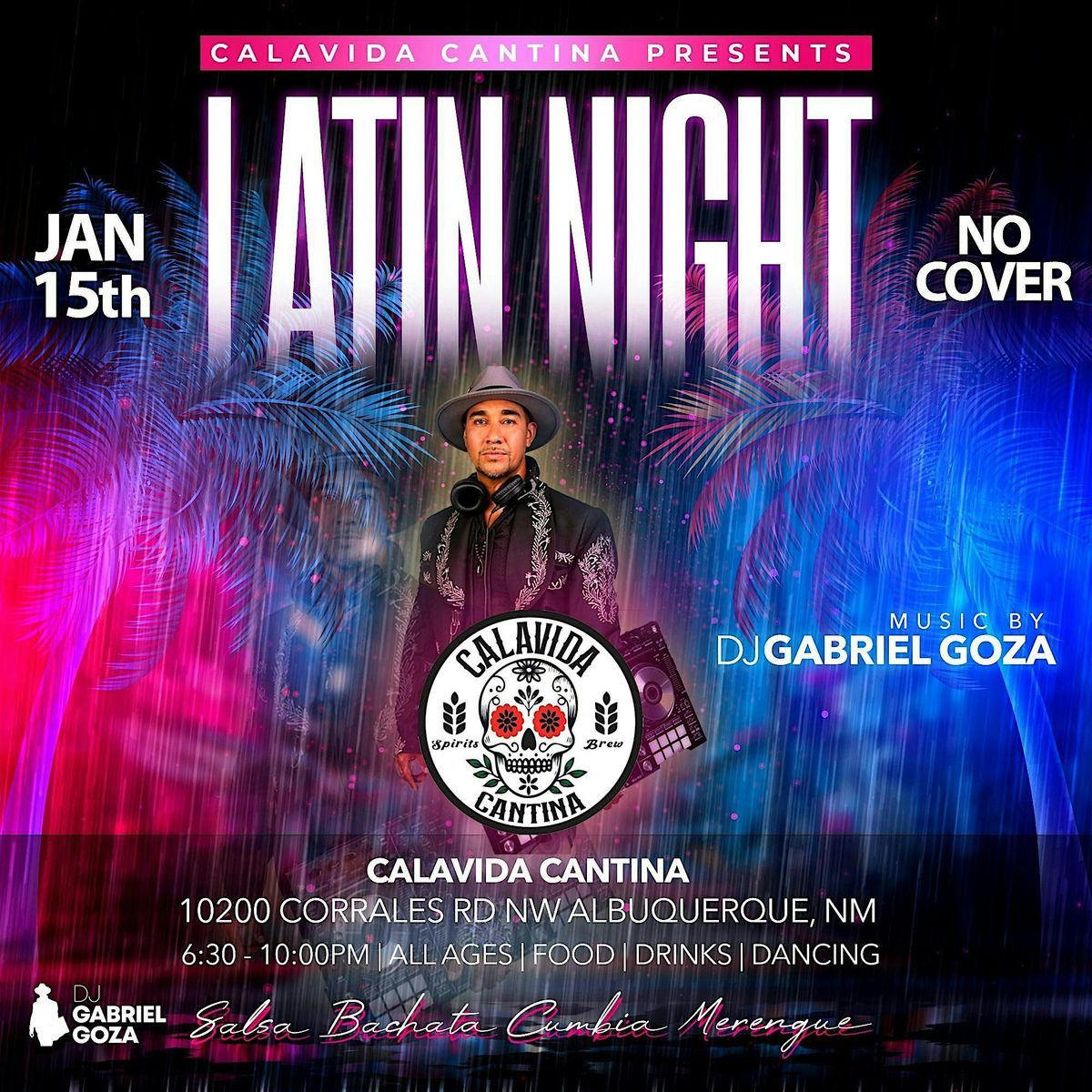 Latin Night at Calavida Cantina is back by popular demand!Music by DJ Gabriel Goza spinning Salsa, Bachata, Cumbia, Merengue y mas.No Cover