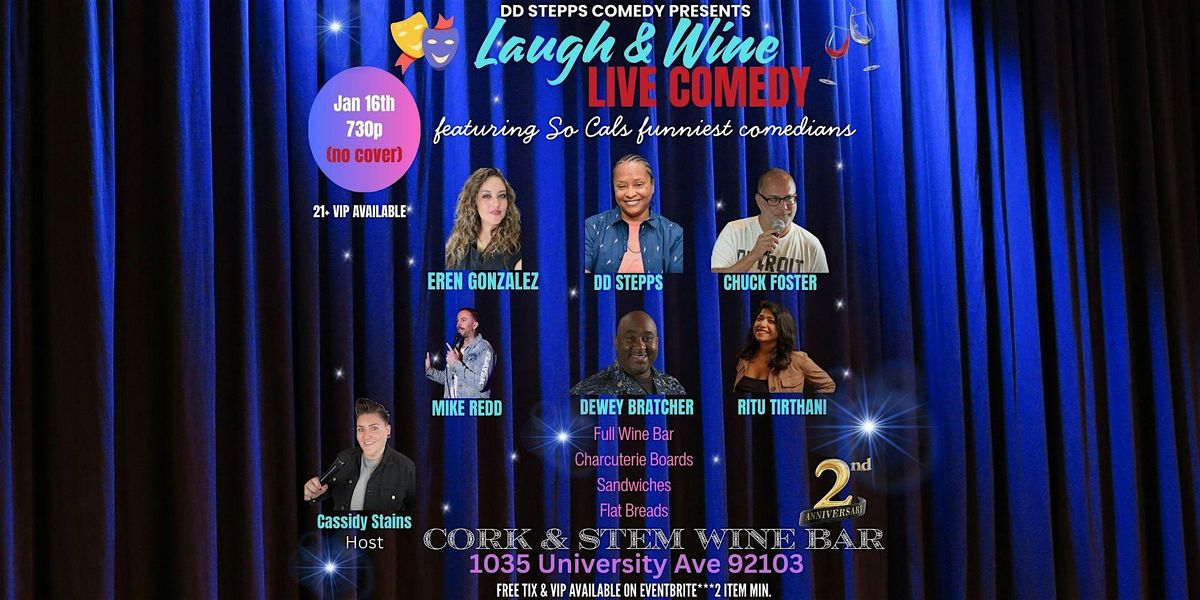 Get ready for a night full of giggles, gags, and great vibes! Join us in person for the Laugh & Wine Live Comedy Show in Hillcrest, Featuring comedy from Ritu Tirthani, Mike Redd, Chuck Foster, Eren Gonzalez, Dewey Bratcher and DD Stepps. Hosted by Cassidy Stains. Don’t miss out on this fun-packed evening—grab your friends and come enjoy the good times, delicious wine,food and fun.